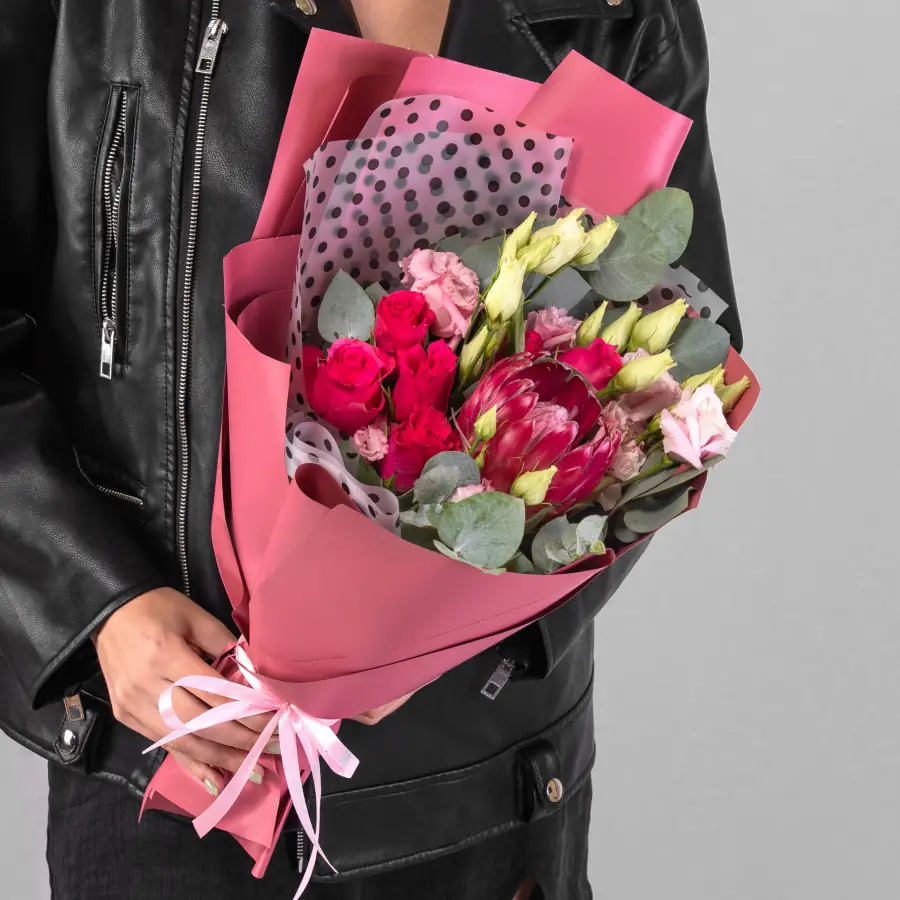 Букет из протеи и эустомы - пример оформления на фото. Состоит из: Эустома - 3 шт,