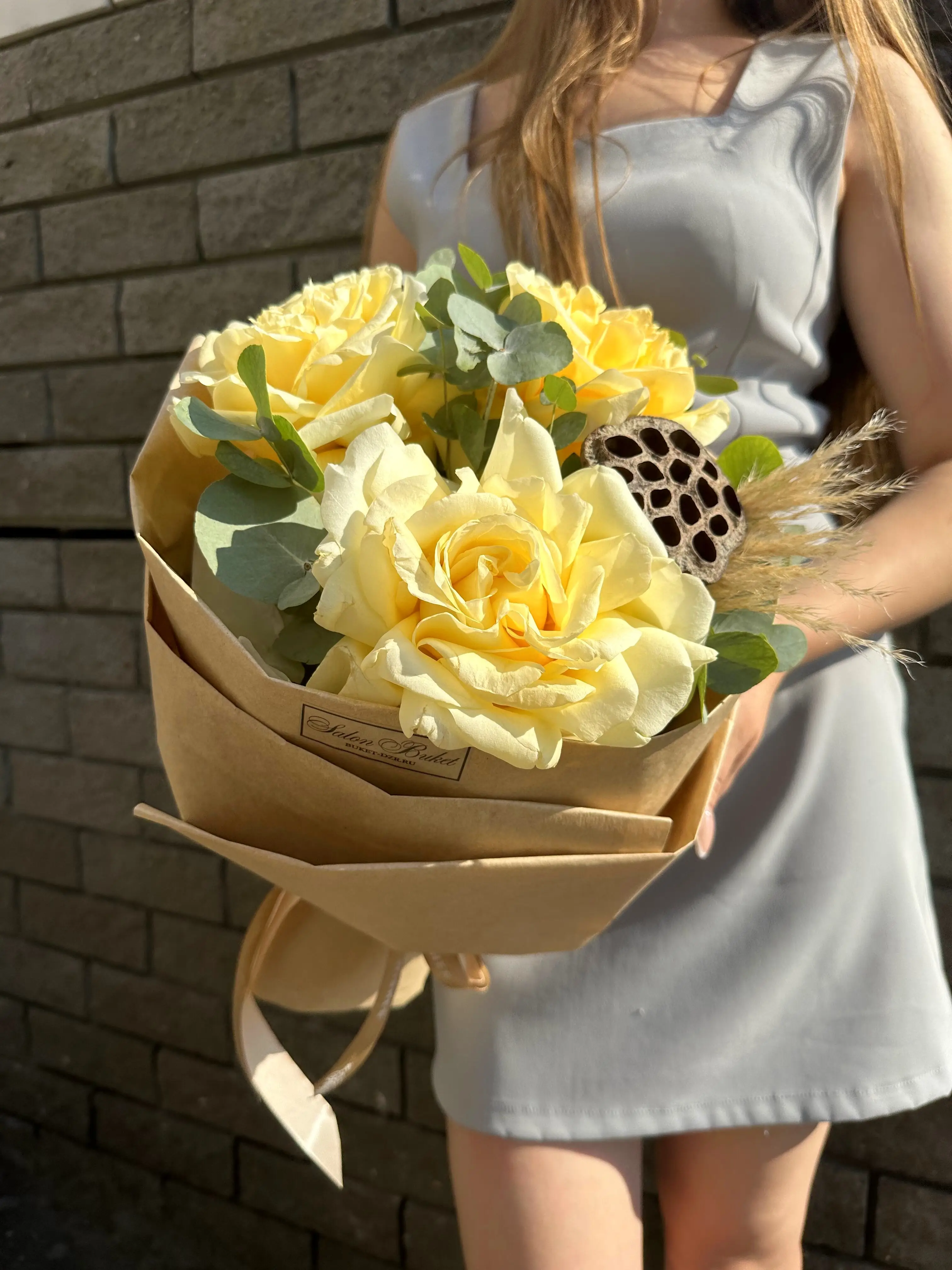 Авторский букет из роз и эвкалипта - пример оформления на фото. Состоит из: Роза - 3 шт,