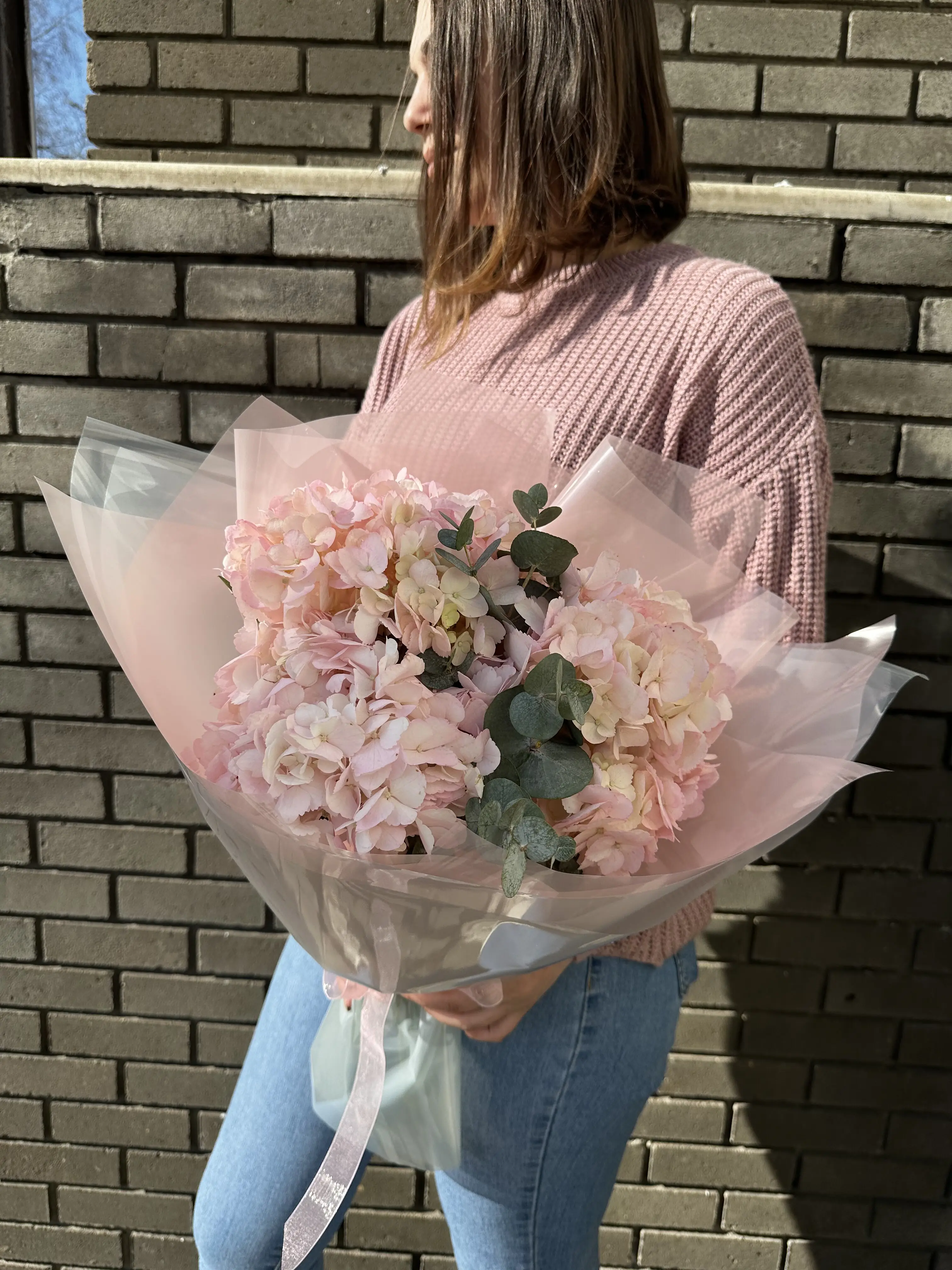 Розовые гортензии с Зеленью - пример оформления на фото. Состоит из: Гортензия - 3 шт,