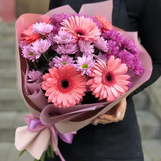 Букет герберы с хризантемами - пример оформления на фото. Состоит из: Гербера - 5 шт.,