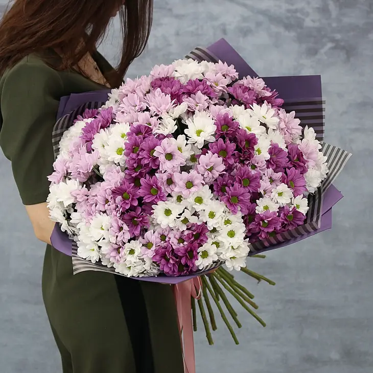 Букет "Нежные Хризантемы" - пример оформления на фото. Состоит из: Хризантема Ромашка Белая - 11 шт., 11 шт Фиолетовых кустовых хризантем, Хризантема Ромашка Розовая - 13 шт., Упаковка, Лента атлансая, . Собираем только из свежих цветов, после сборки пришлем Вам фото. Доставим по г. Дзержинску и Нижегородской области, стоимость - 11150 руб..