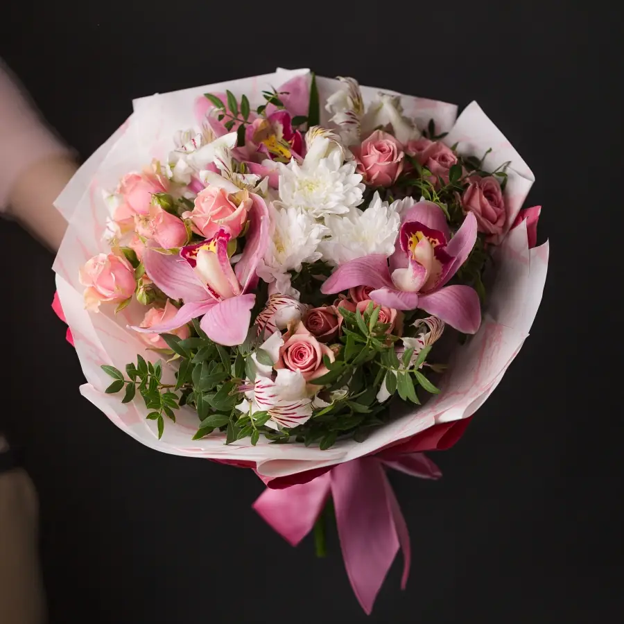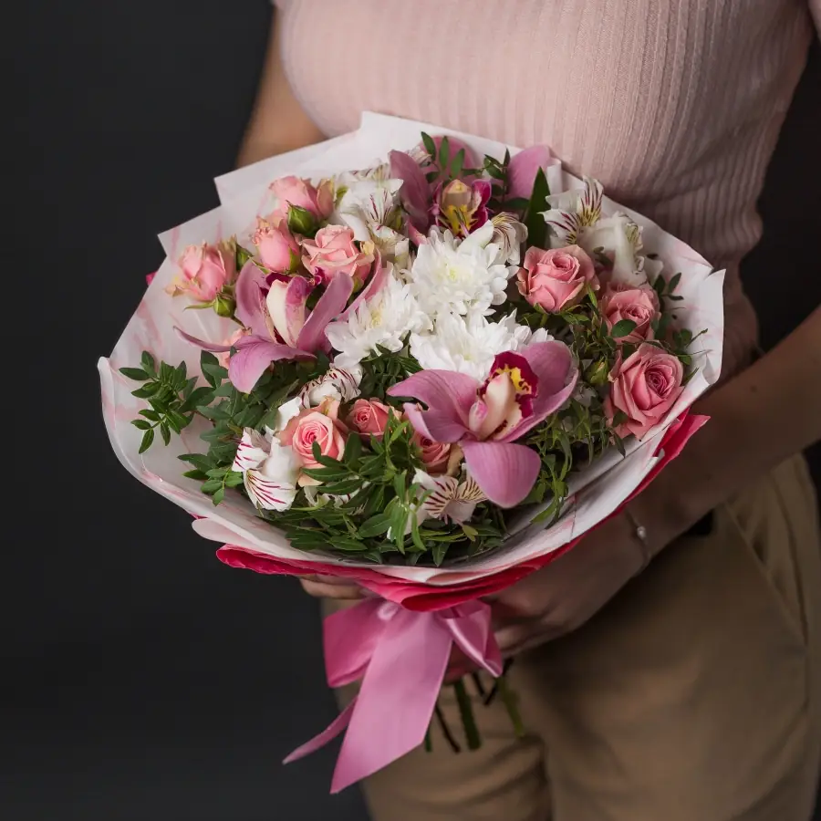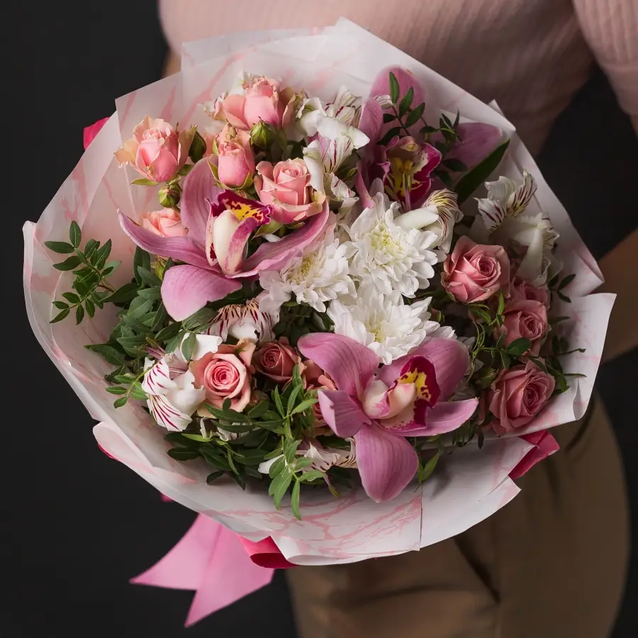 Букет "Облако" - пример оформления на фото. Состоит из: Орхидея Цимбидиум Розовая (1 цветок) - 3 шт.,