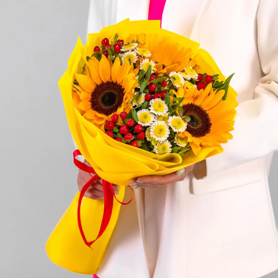 Букет "Подсолнухи" - пример оформления на фото. Состоит из: Подсолнух - 3 шт,