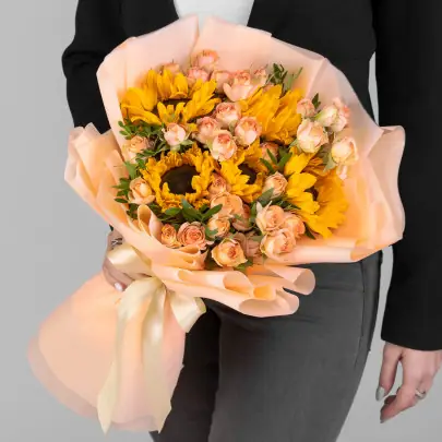 Букет подсолнухов с кустовой розой - пример оформления на фото. Состоит из: Подсолнух - 5 шт, Роза кустовая - 6 шт, Зелень, Упаковка, Лента атласная, . Собираем только из свежих цветов, после сборки пришлем Вам фото. Доставим по г. Дзержинску и Нижегородской области, стоимость - 4150 руб..