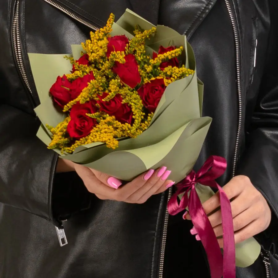 Букет "Роза и Солидаго" мини - пример оформления на фото. Состоит из: Роза Красная 40 см.) - 9 шт.,