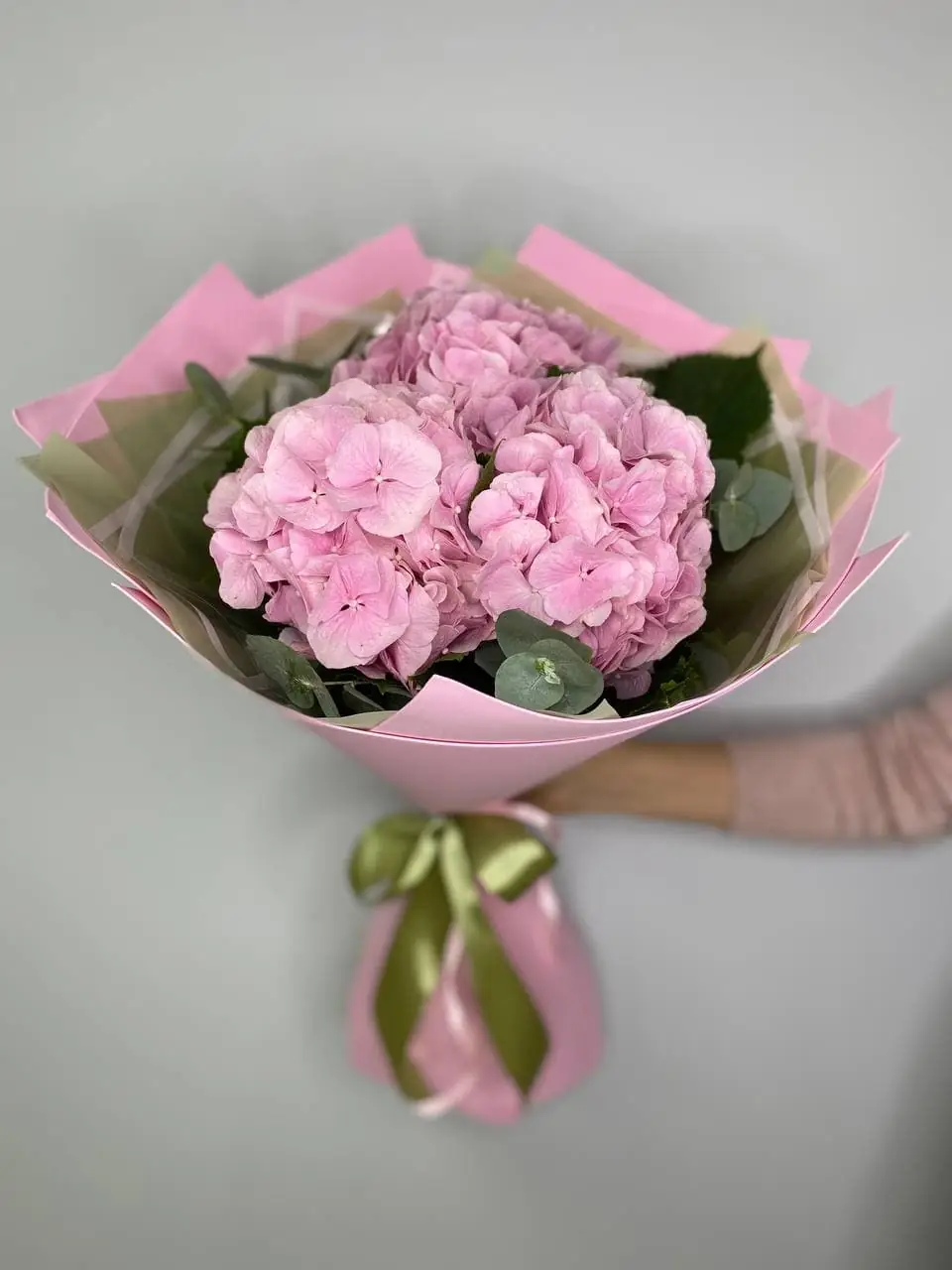 Букет розовых гортензий - пример оформления на фото. Состоит из: Гортензия - 3 шт., Упаковка, лента атласная. Собираем только из свежих цветов, после сборки пришлем Вам фото. Доставим по г. Дзержинску и Нижегородской области, стоимость - 2970 руб..