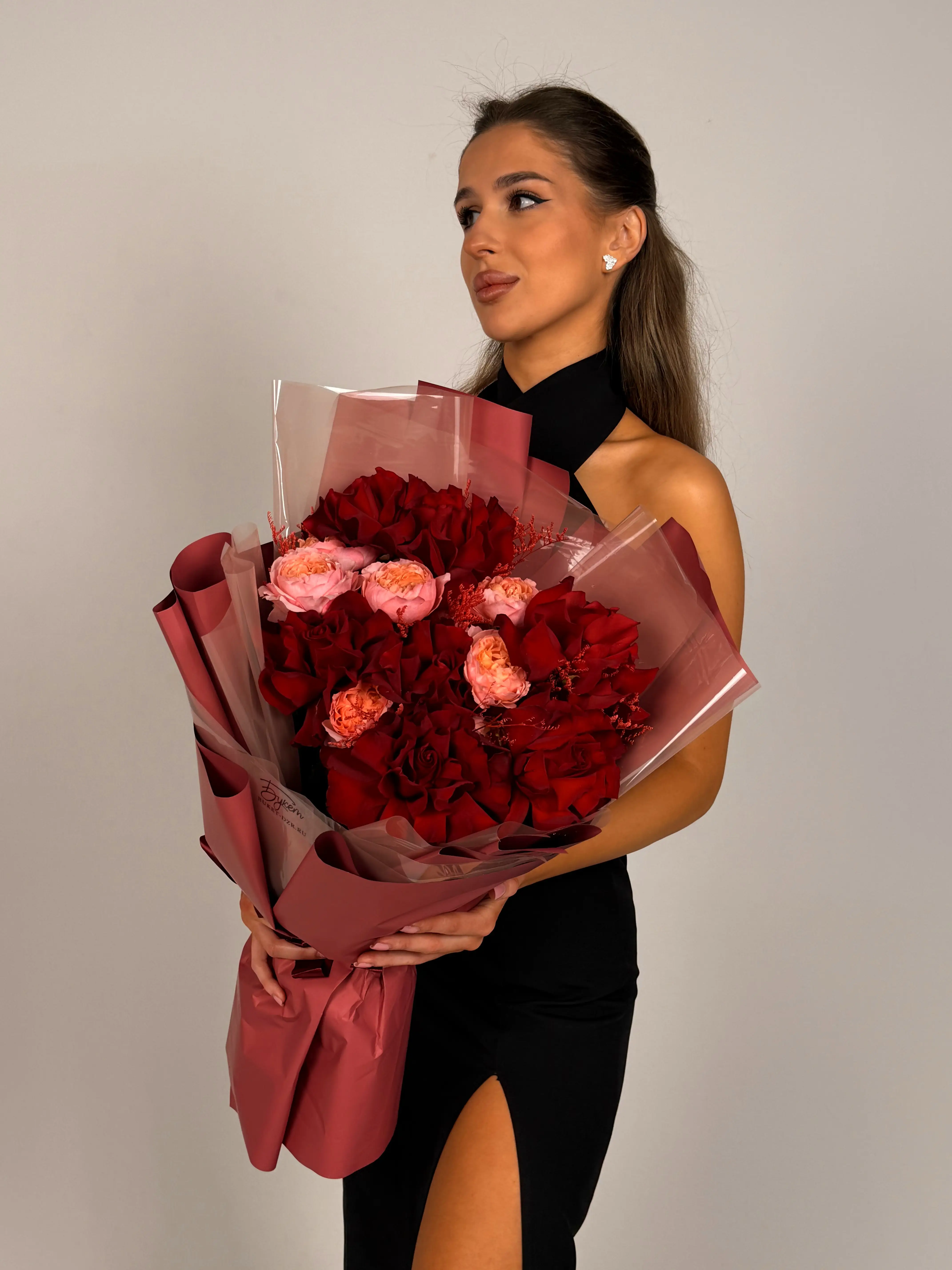 Букет с бордовыми розами - пример оформления на фото. Состоит из: Роза Эквадор - 7 шт,