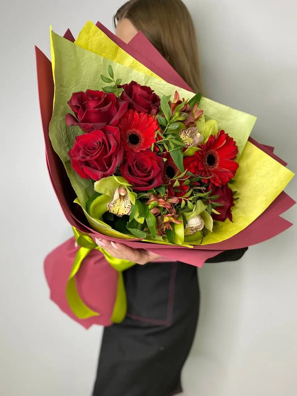 Букет с герберой и орхидеей - пример оформления на фото. Состоит из: Роза - 5 шт.,