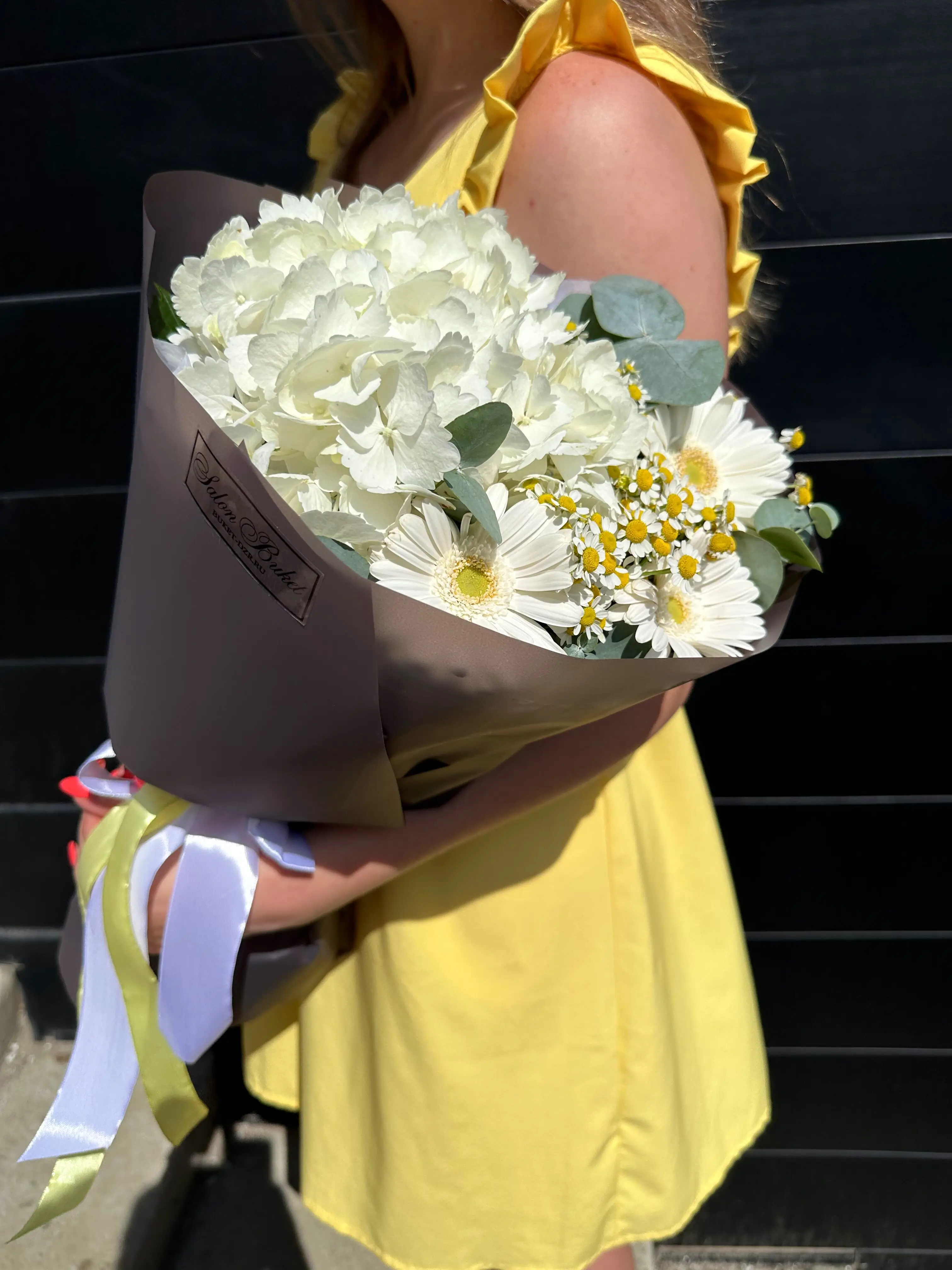 Гортензия и ромашки - пример оформления на фото. Состоит из: Гортензия - 1 шт,