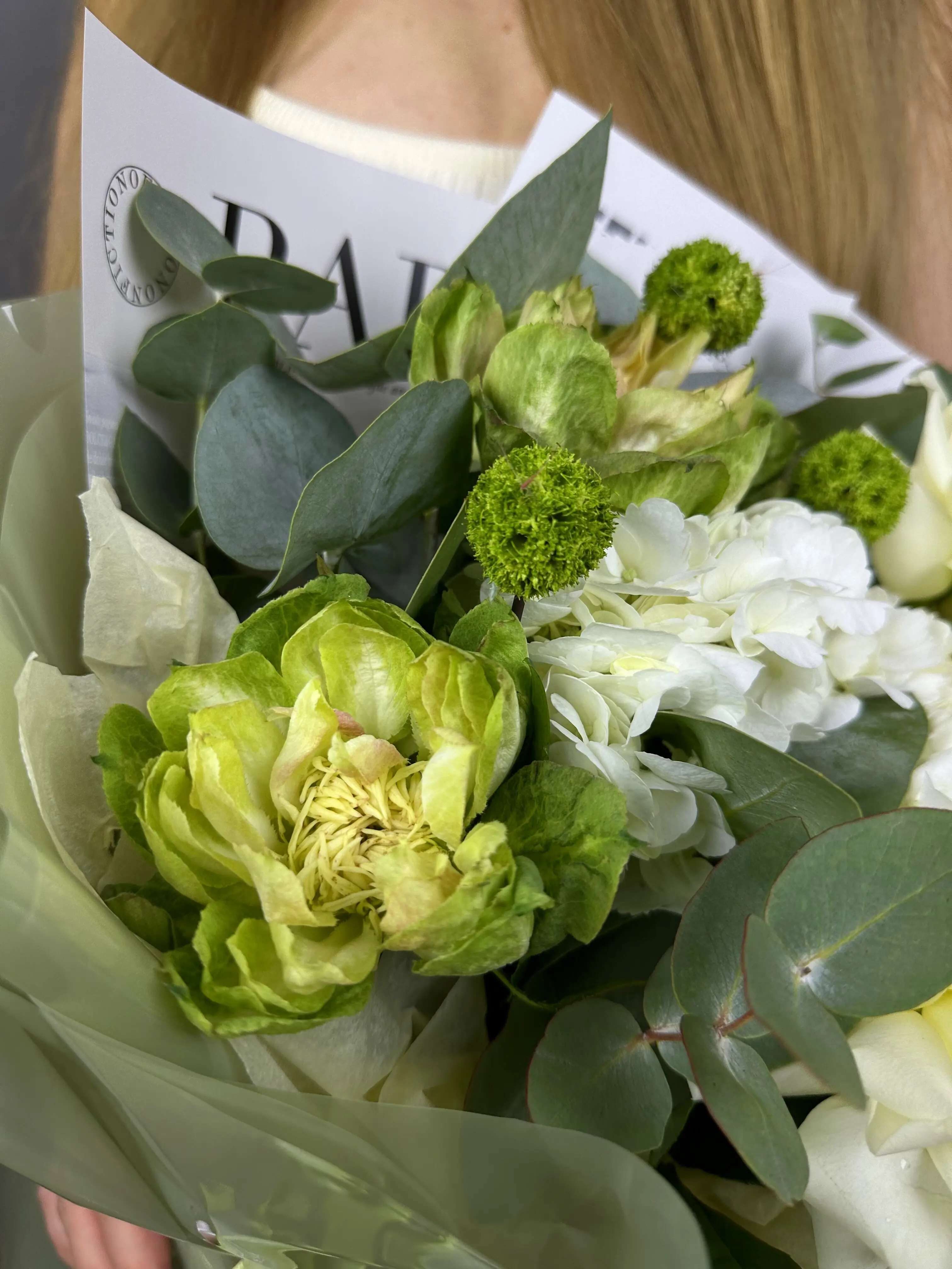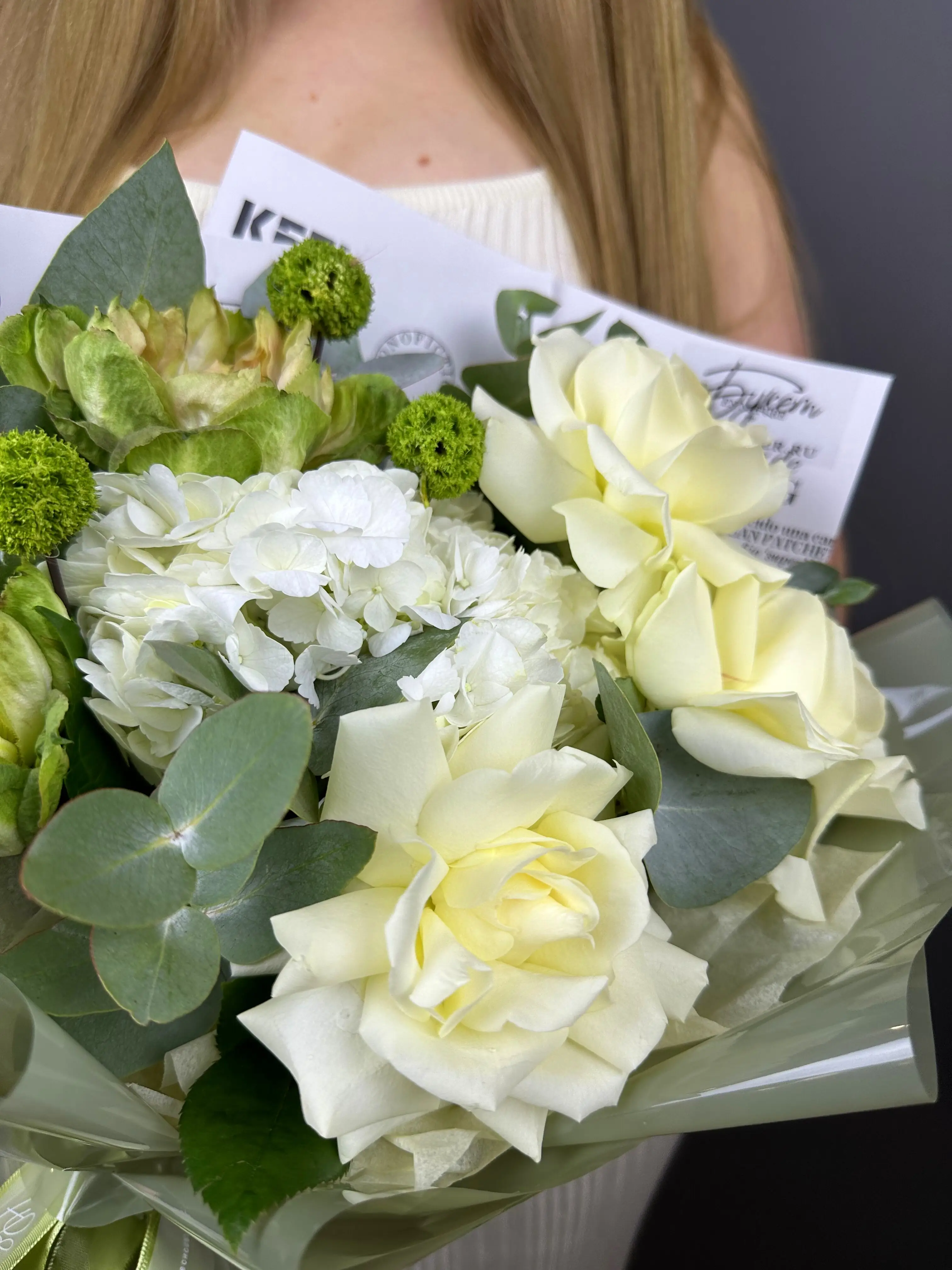 Букет с гортензией и зелеными розами - пример оформления на фото. Состоит из: Гортензия - 1 шт,