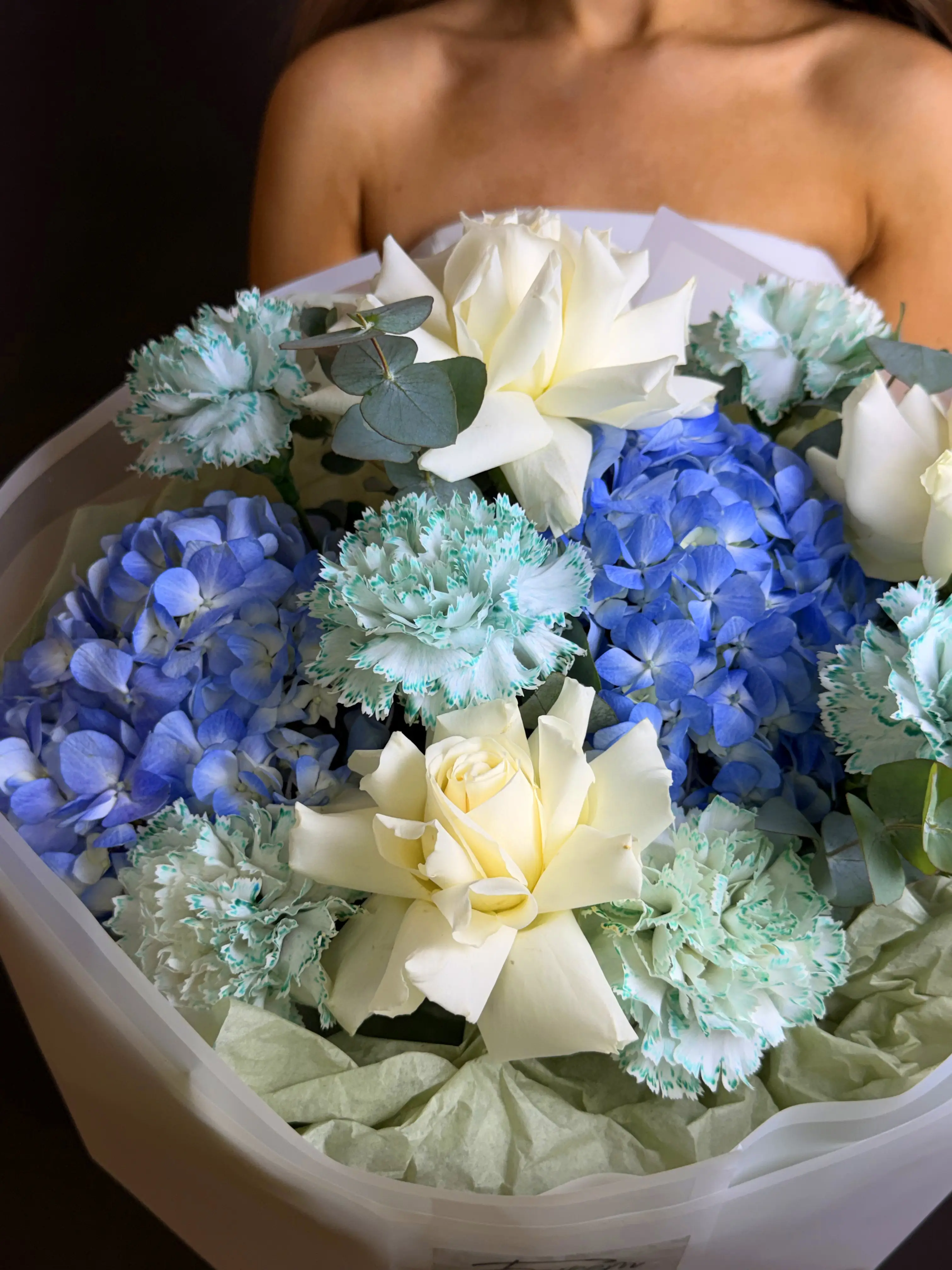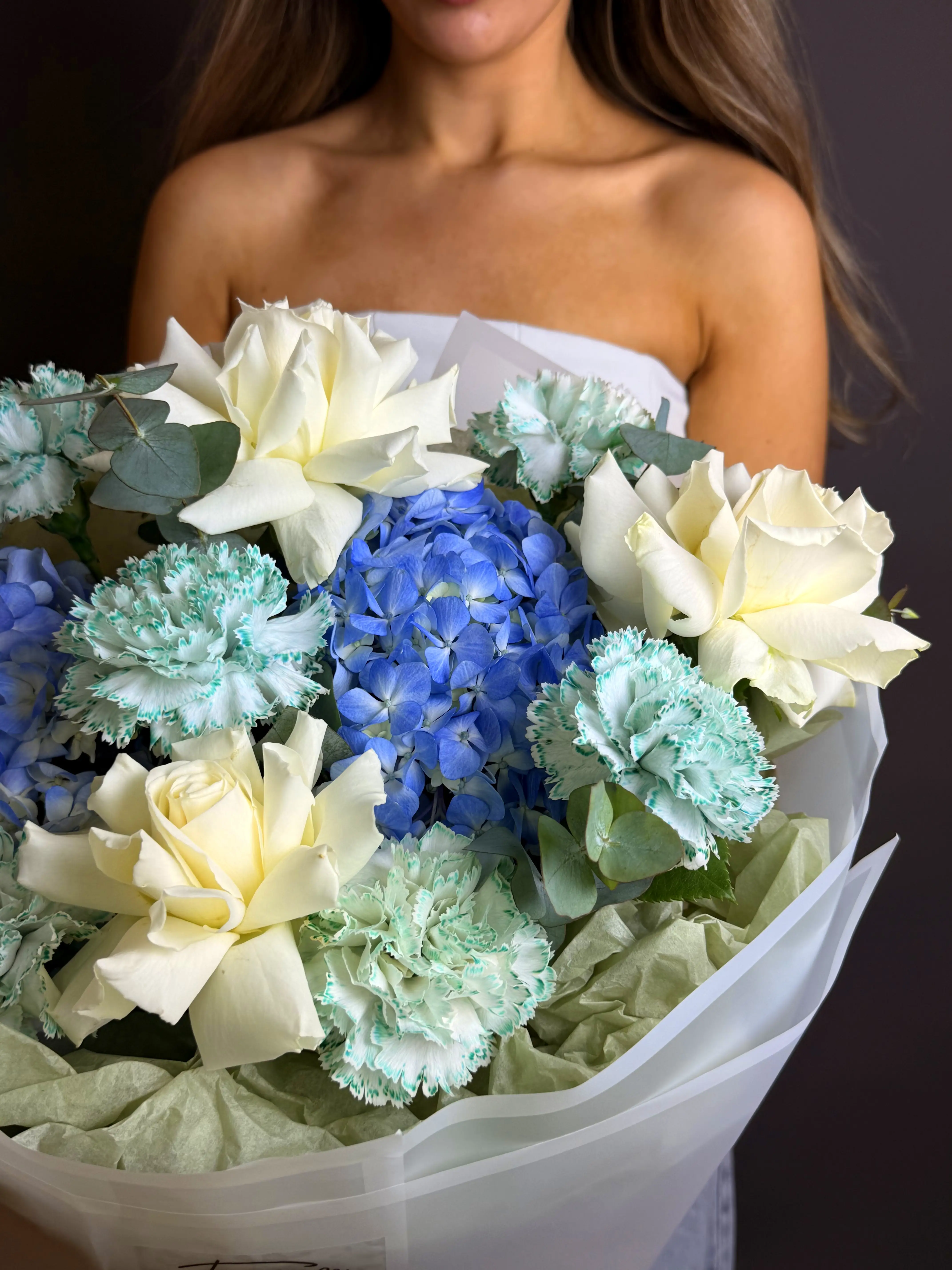 Букет с гортензиями и бирюзовыми диантусами - пример оформления на фото. Состоит из: Гортензия - 2 шт,