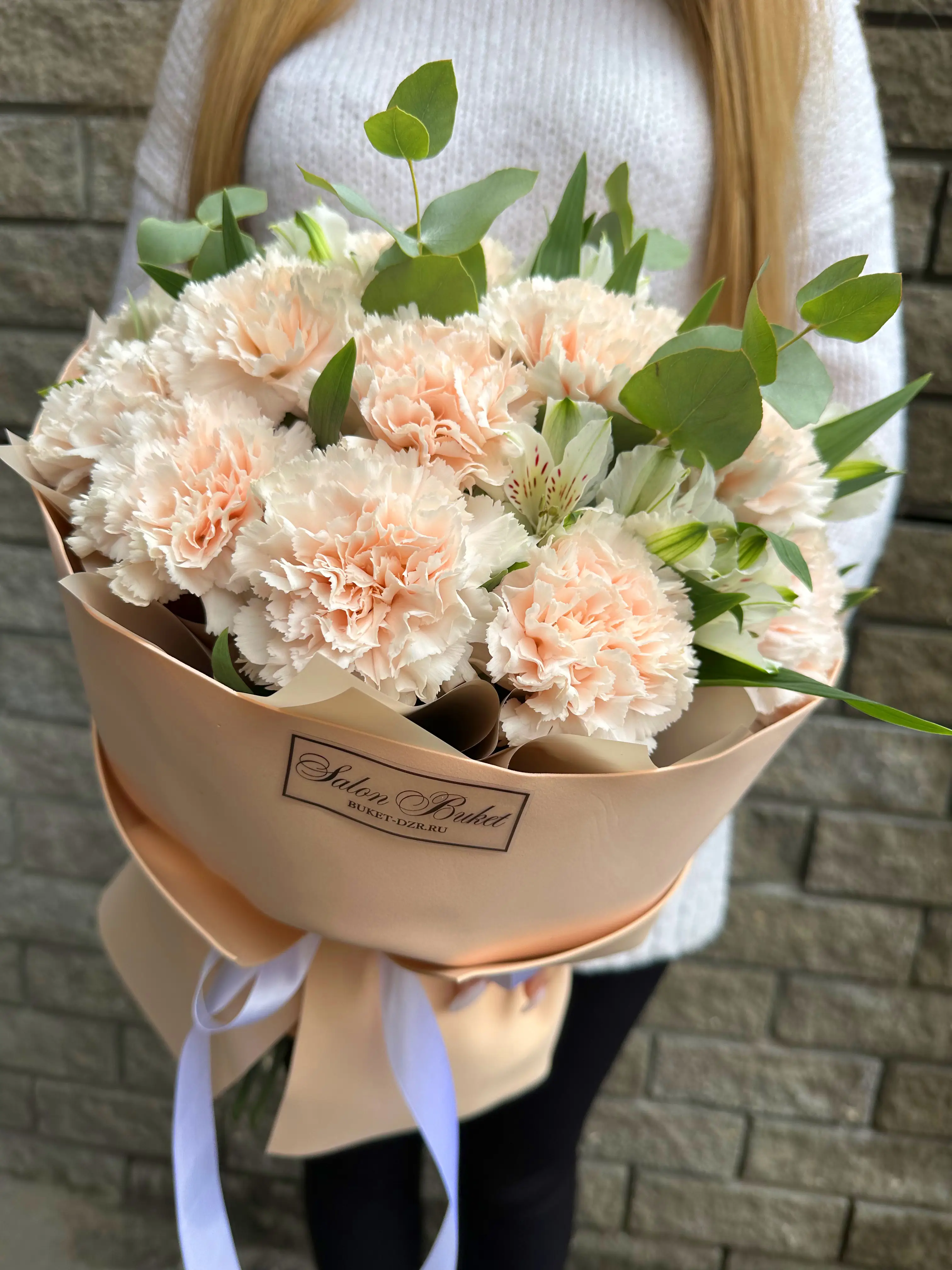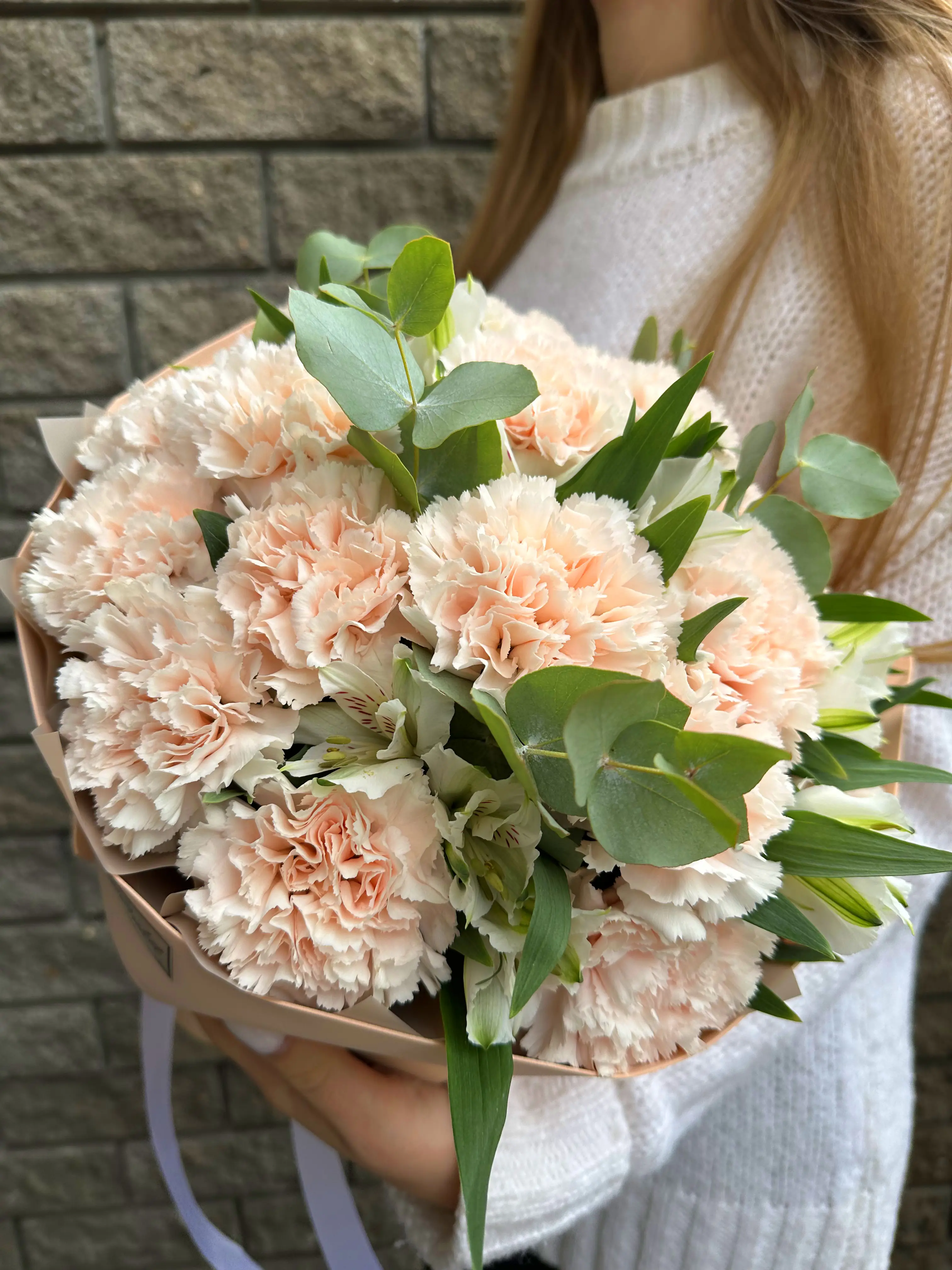 Композиция с гвоздикой и альстромерий - пример оформления на фото. Состоит из: Диантус - 19 шт,