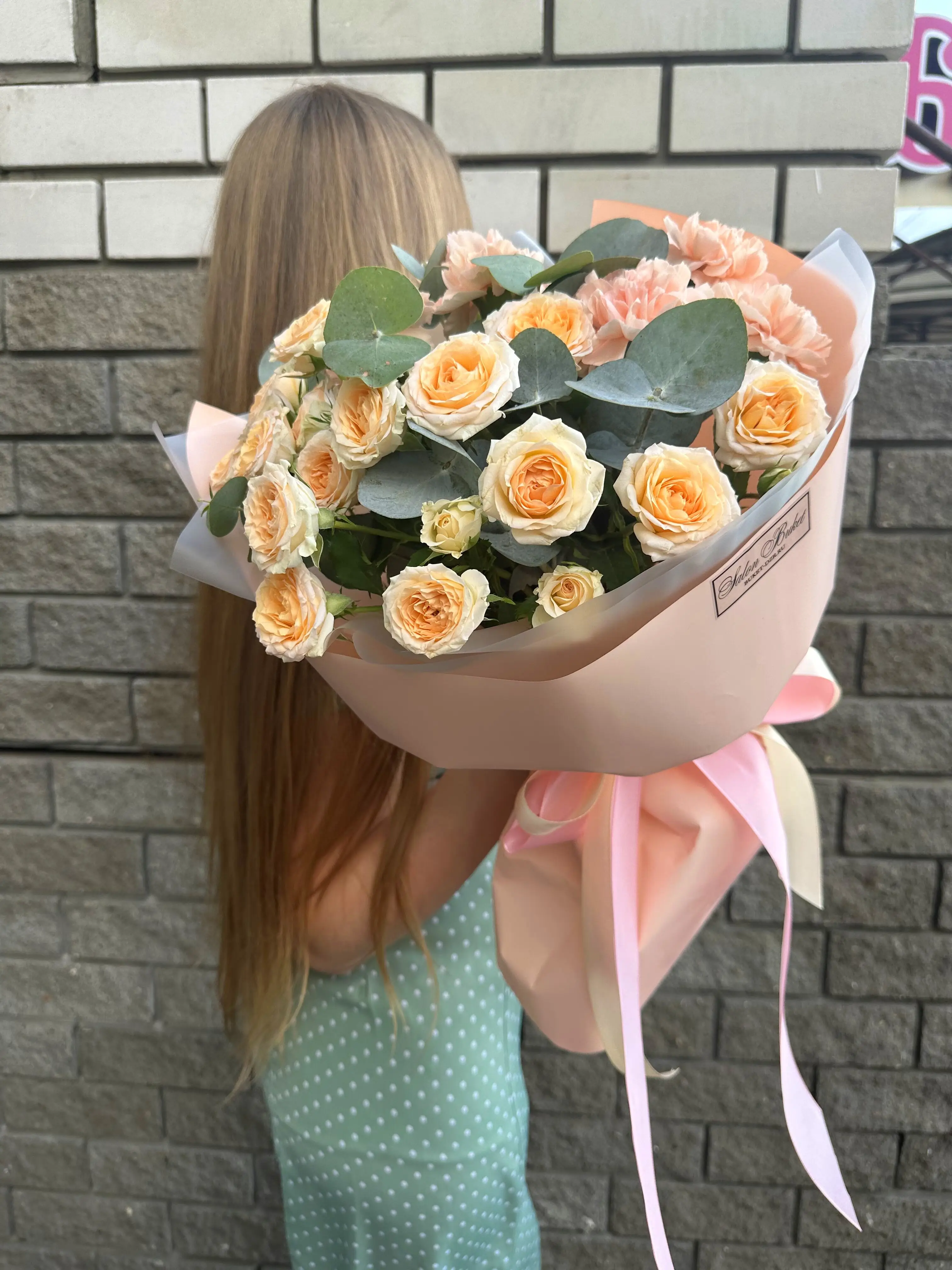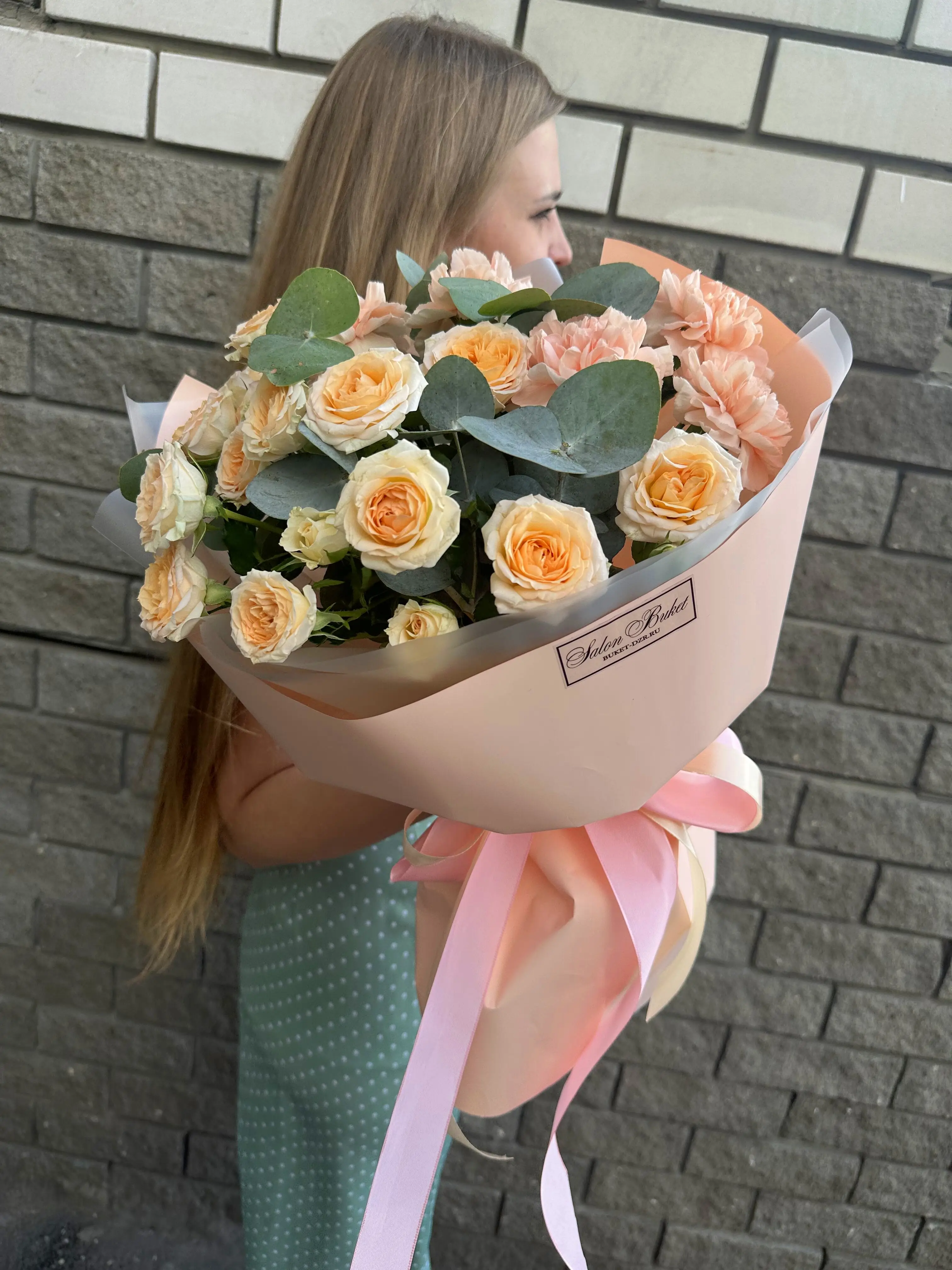 Гвоздика и кустовая Роза - пример оформления на фото. Состоит из: Роза Кустовая - 3 шт,
