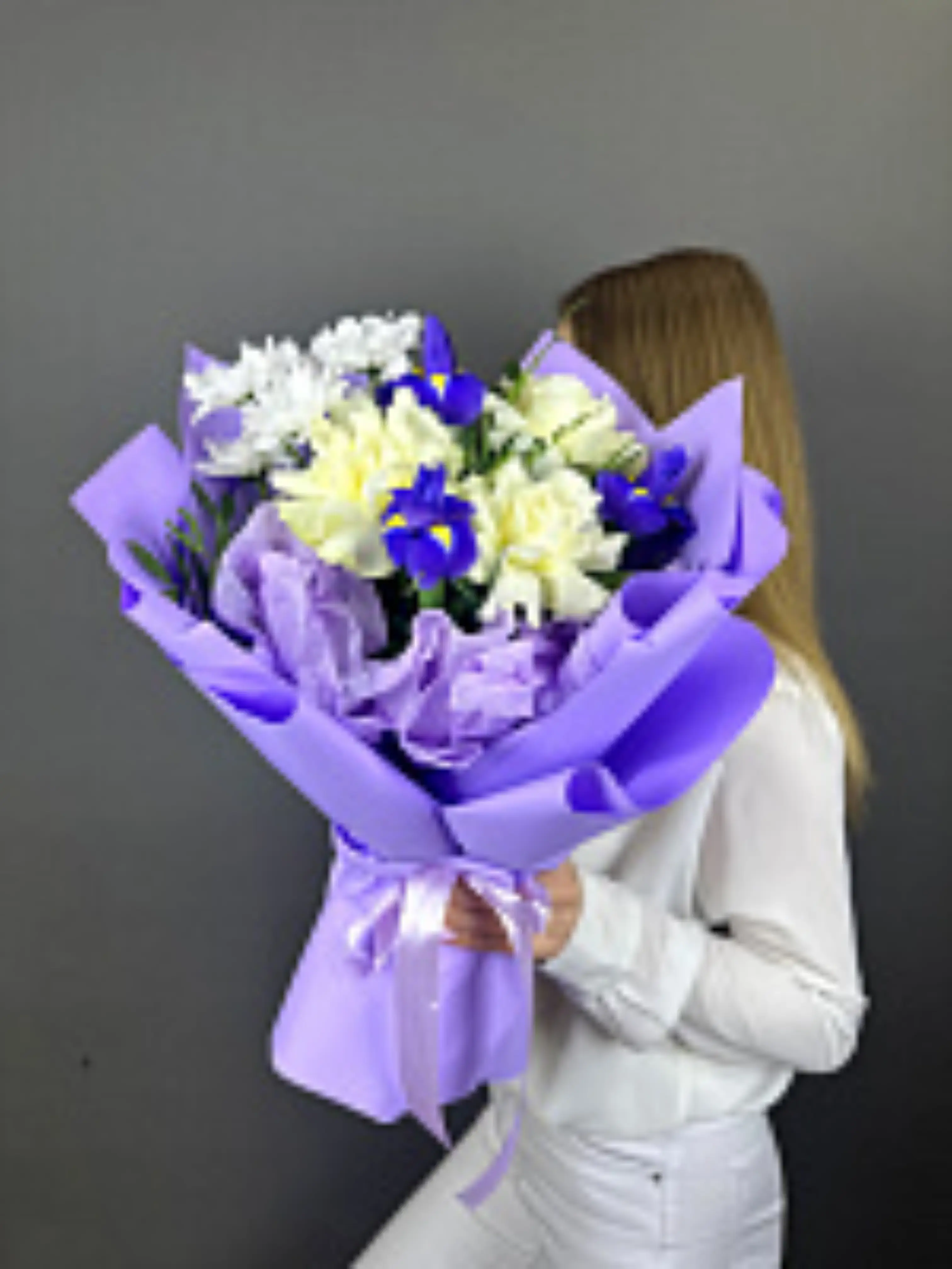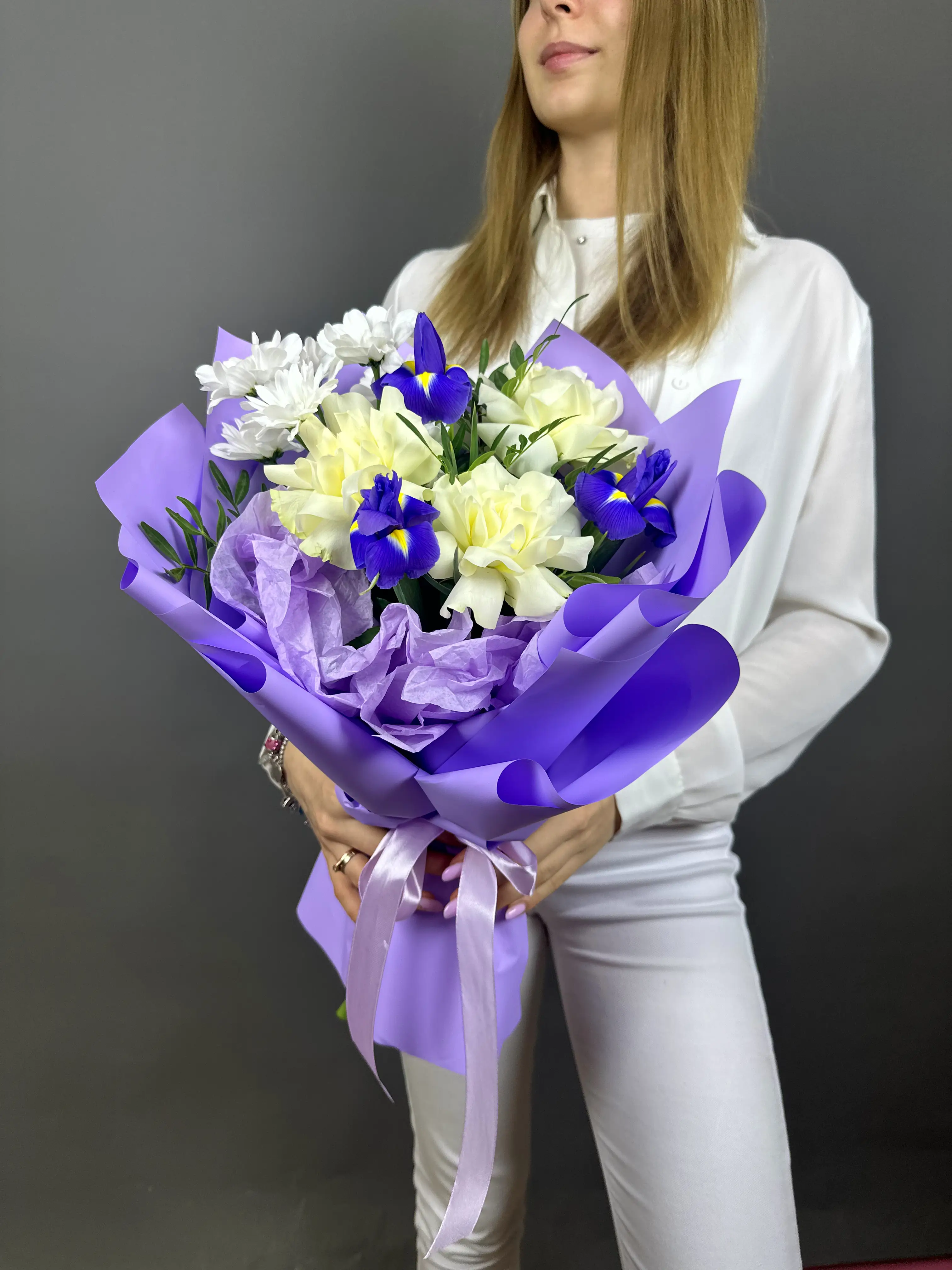 Букет с ирисами и розой - пример оформления на фото. Состоит из: Хризантема кустовая - 1 шт,