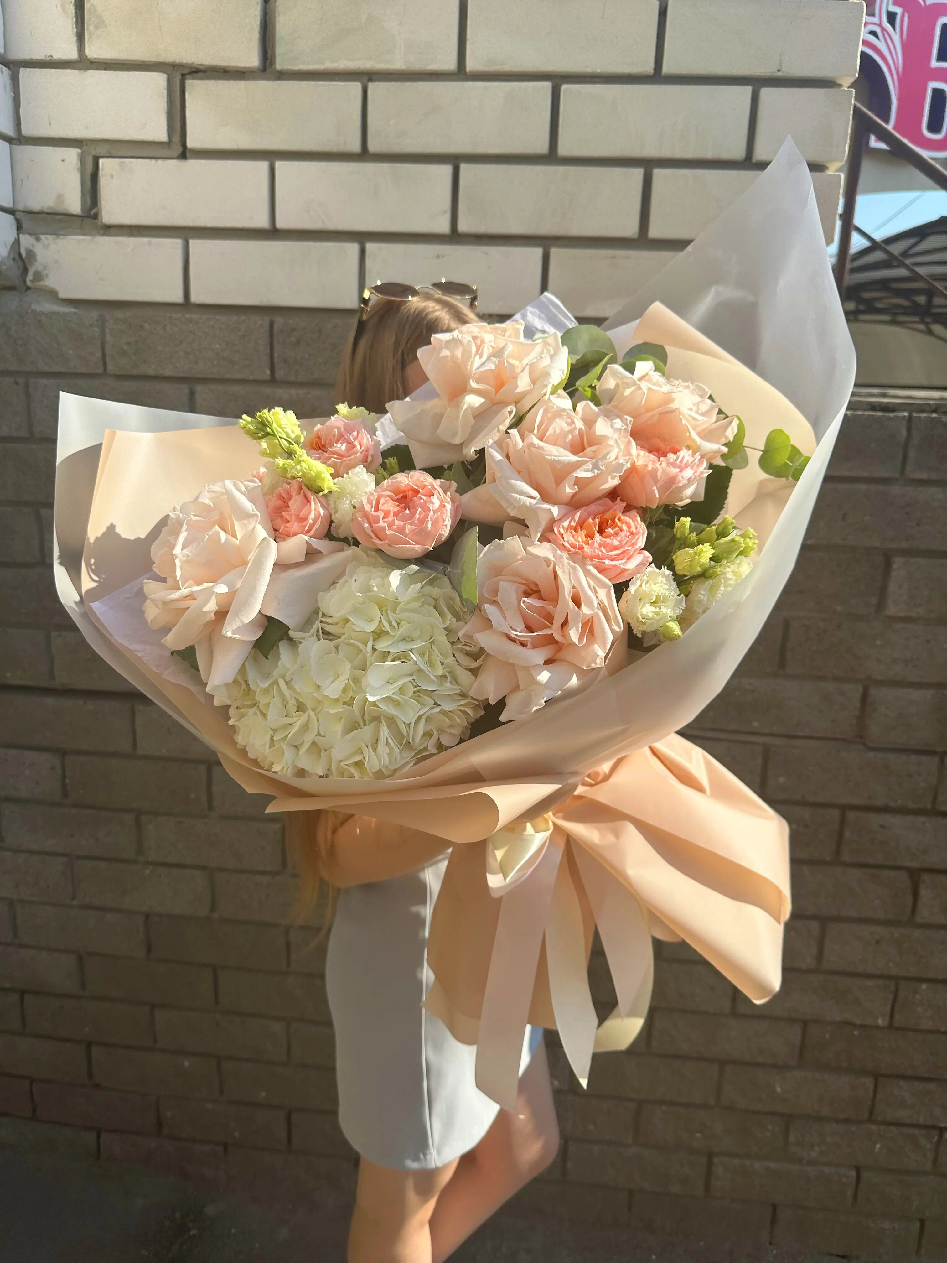 Букет с нежной розой и гортензией из свежих цветов - пример оформления на фото. Состоит из: Гортензия - 1 шт,