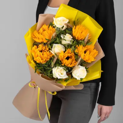 Букет с подсолнухами и белой розой - пример оформления на фото. Состоит из: Подсолнух - 5 шт,