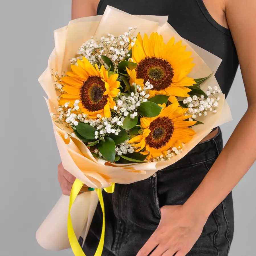 Букет “Подсолнух, зелень, гипсофила” - пример оформления на фото. Состоит из: Подсолнух -3 шт,