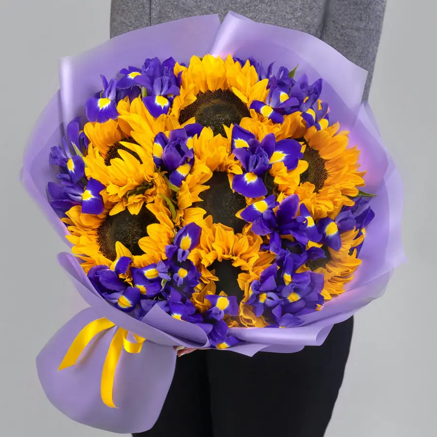 Подсолнухи и ирисы - пример оформления на фото. Состоит из: Подсолнух - 7 шт,