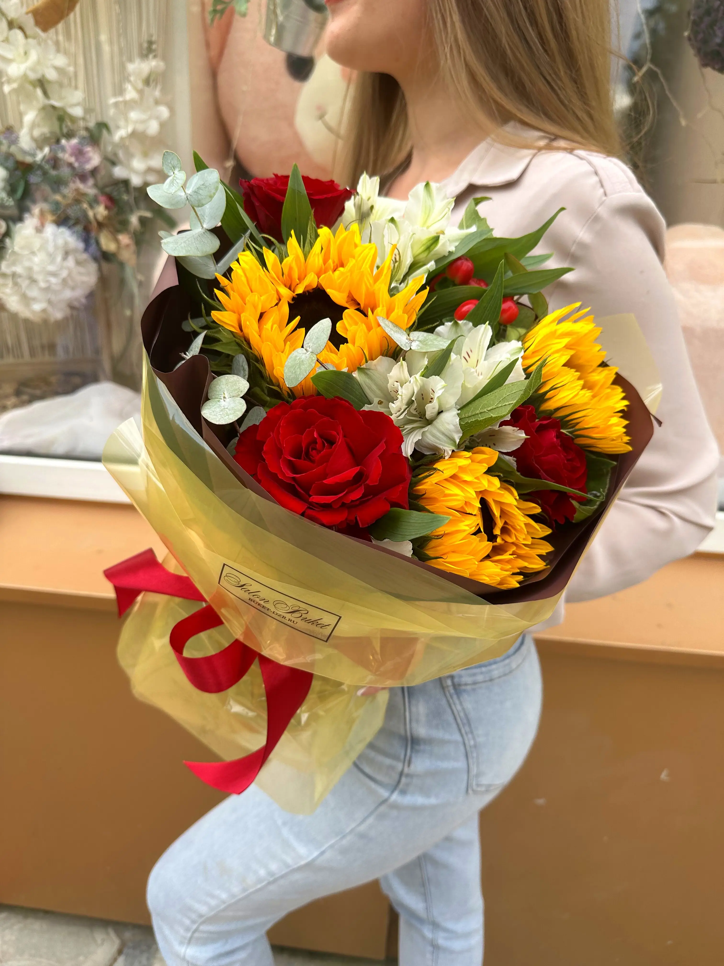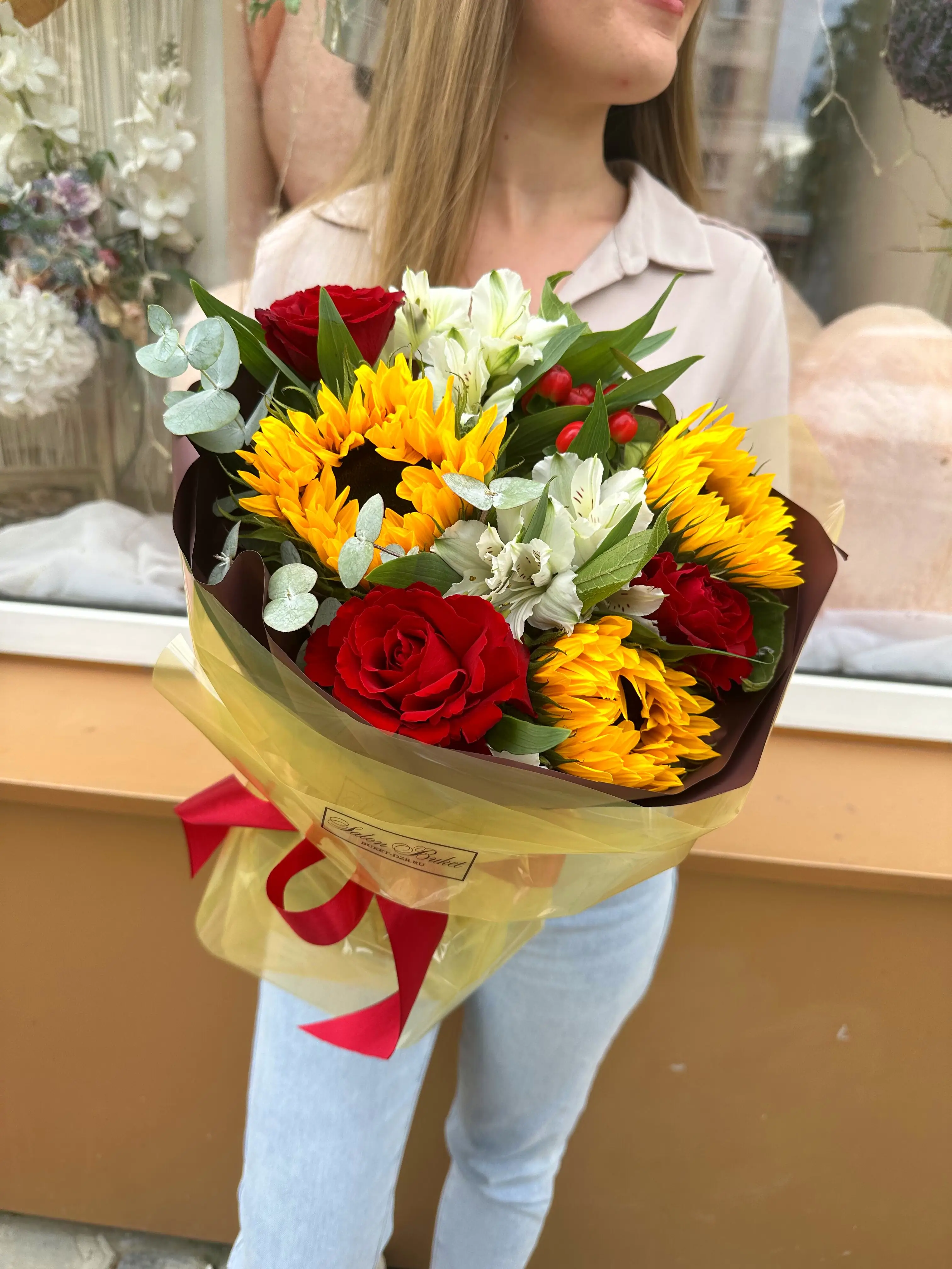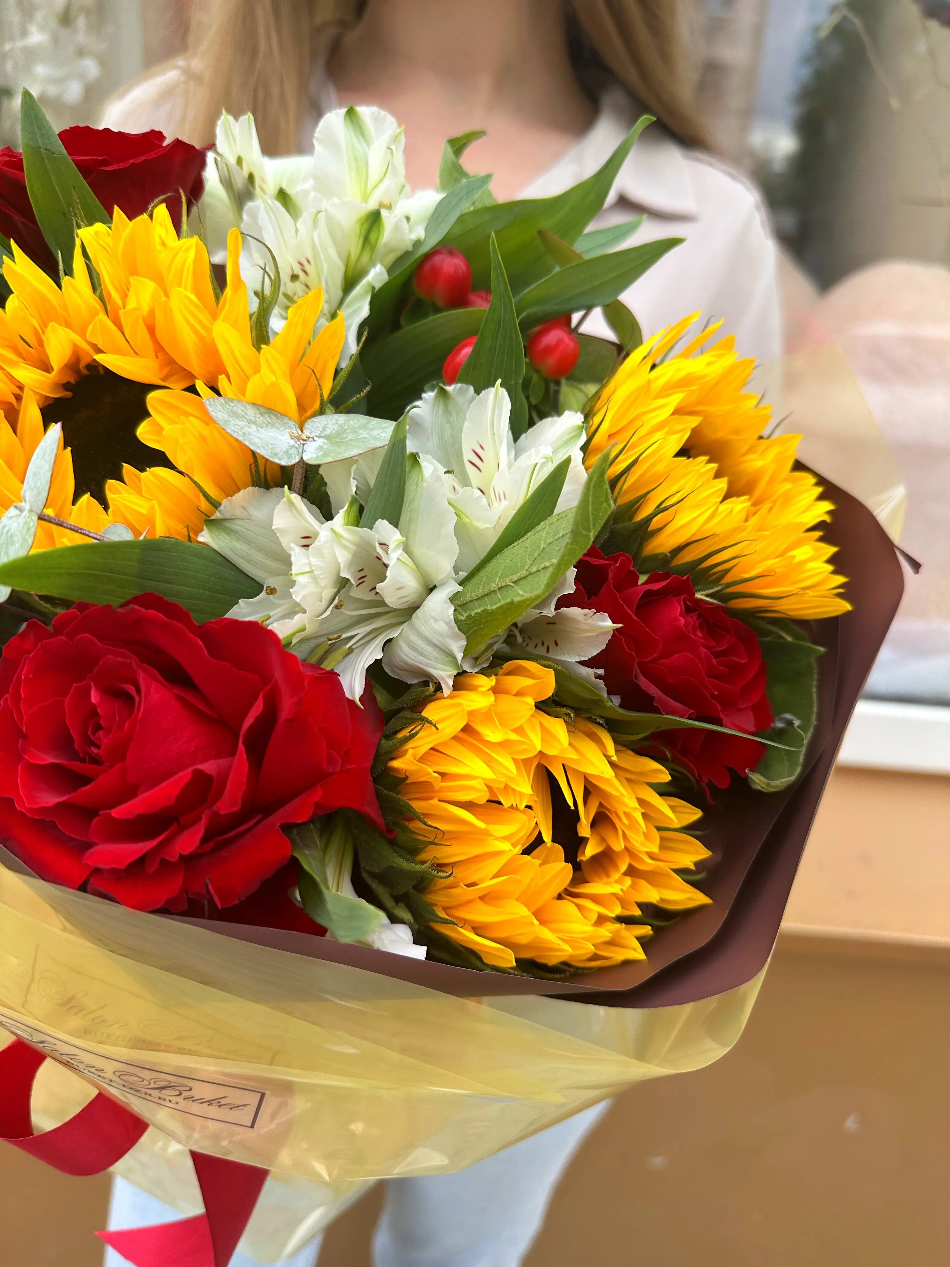 Букет поцелуй - пример оформления на фото. Состоит из: Подсолнух - 3 шт,