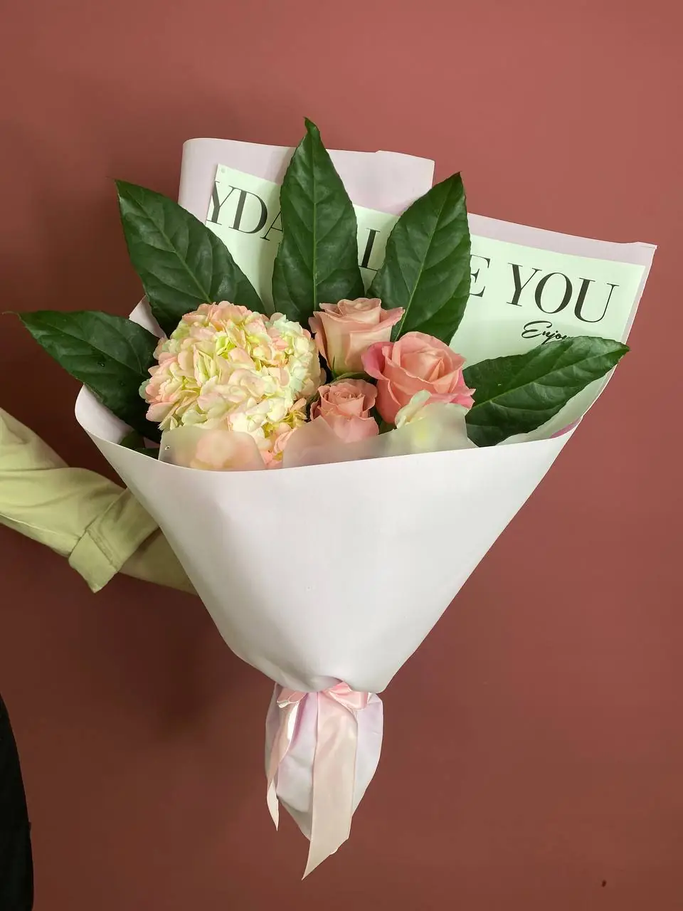 Букет с розами и гортензией - пример оформления на фото. Состоит из: Гортензия - 1 шт.,