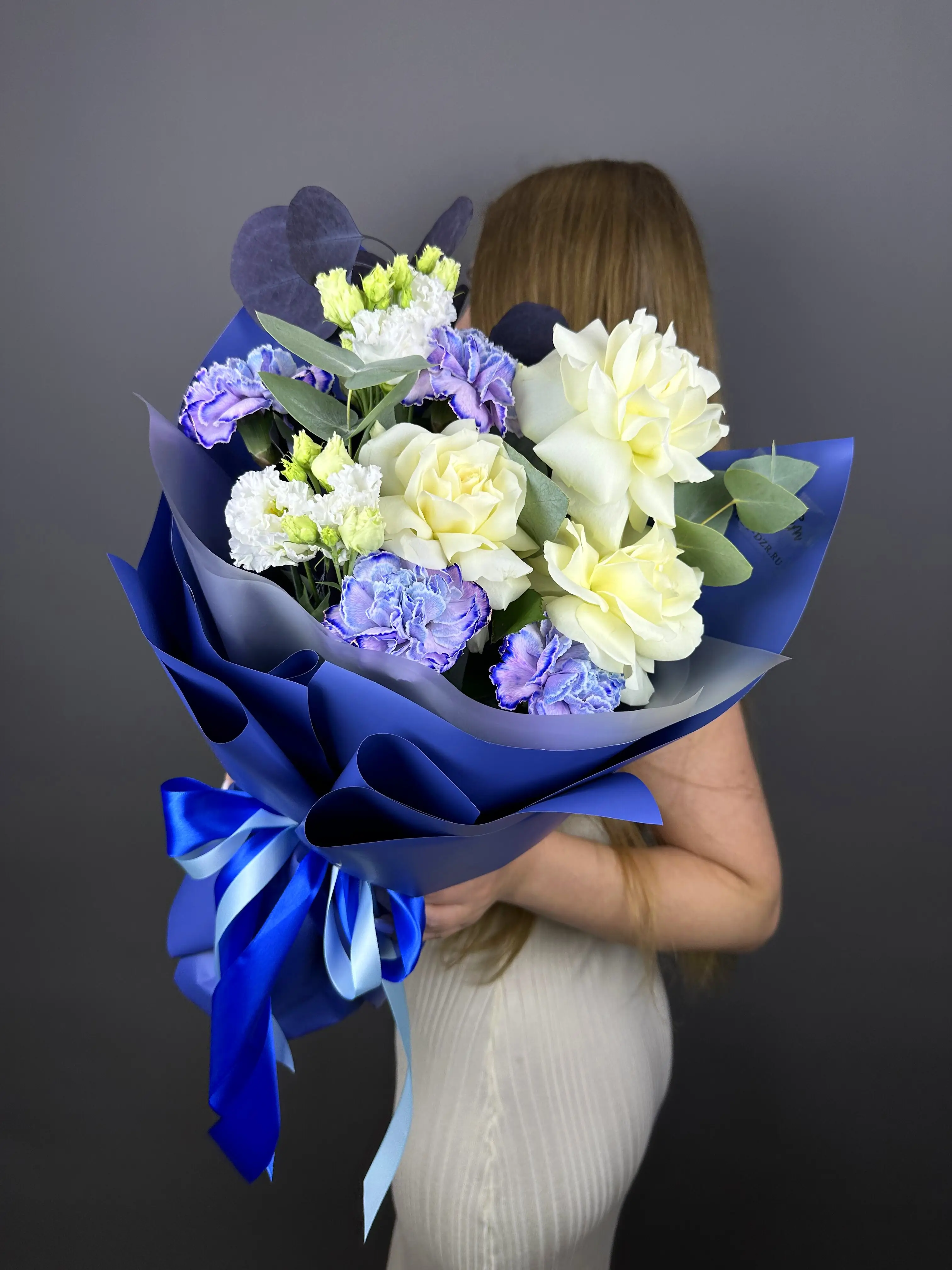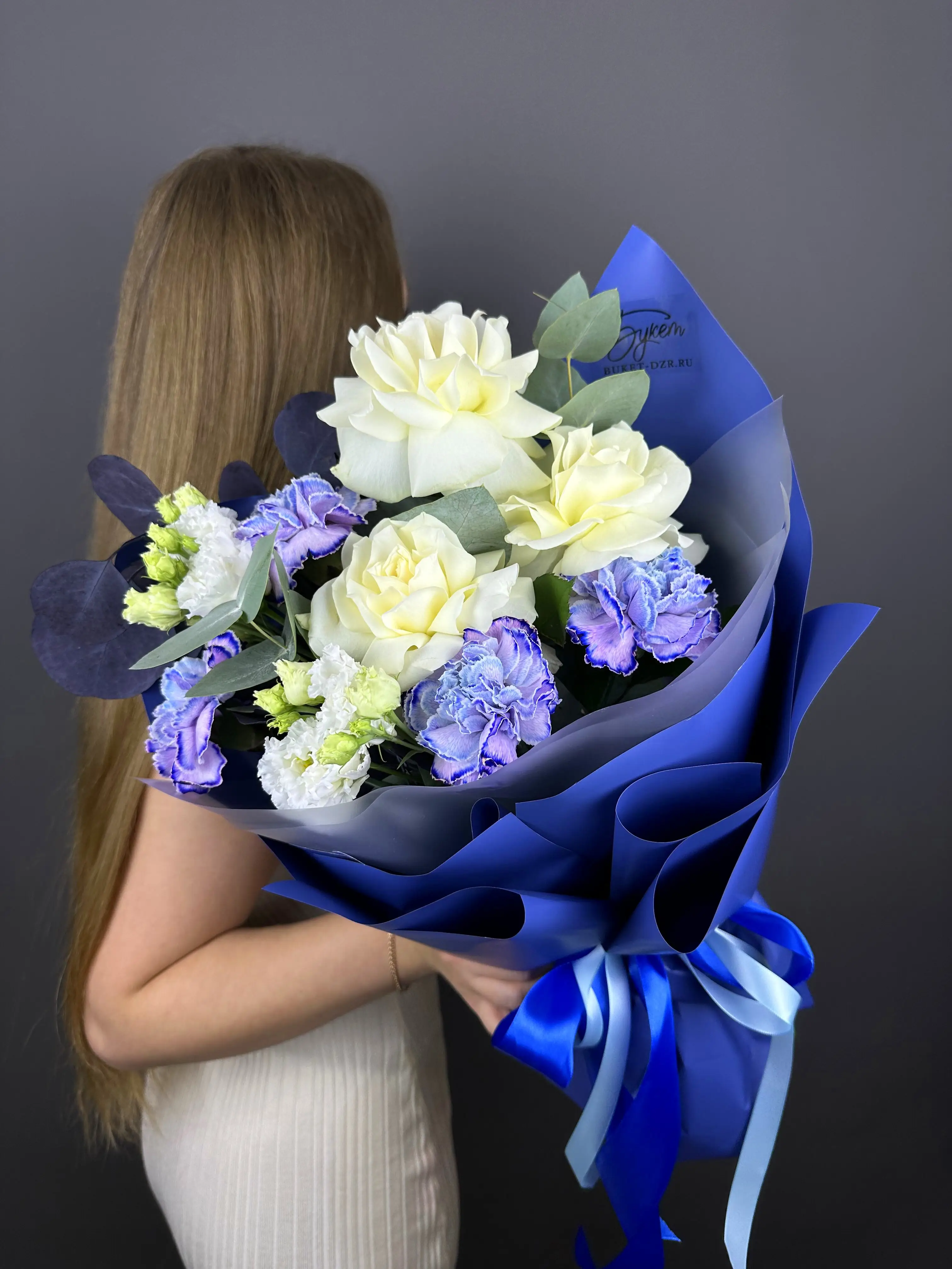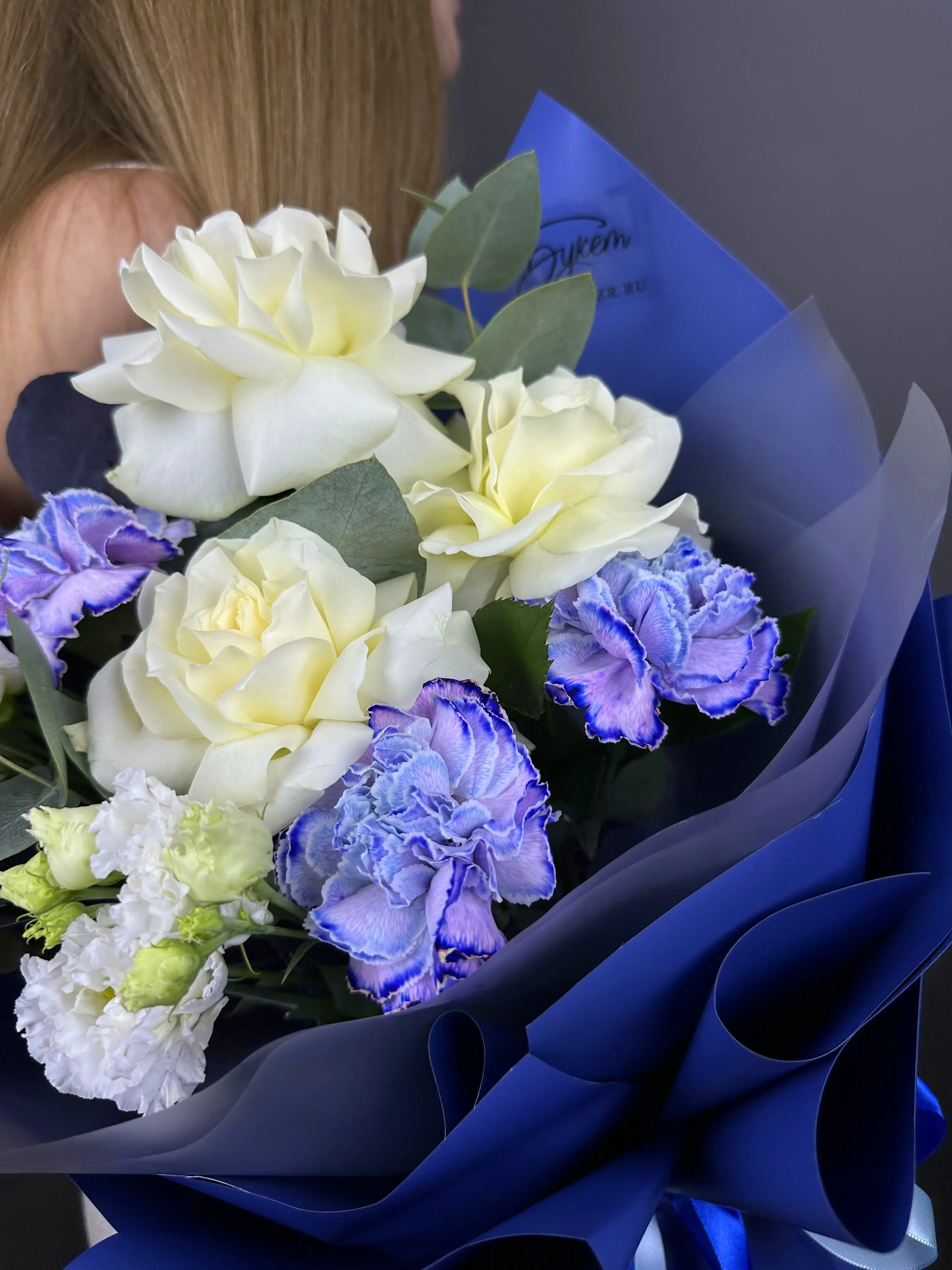 Шикарный Букет с Розами и Синими Диантусами - пример оформления на фото. Состоит из: Роза Кенийская - 3 шт,