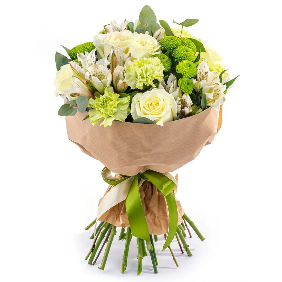 Букет "Сочный Лайм" - пример оформления на фото. Состоит из: Роза белая - 7 шт,