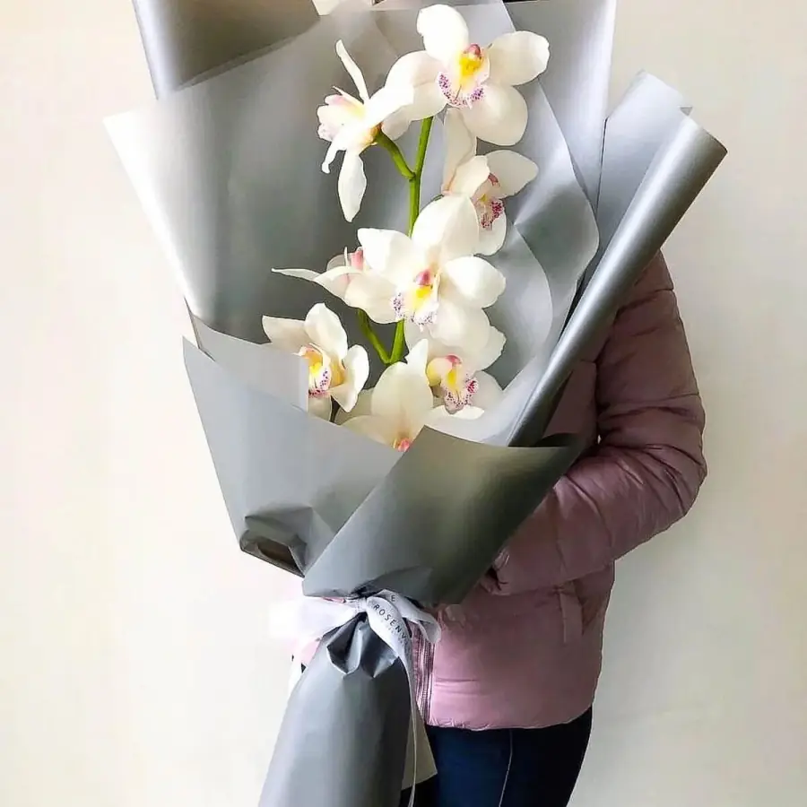 Букет "Ветка Белой Орхидеи" - пример оформления на фото. Состоит из: Орхидея Цимбидиум Белая (ветка) - 1 шт.,