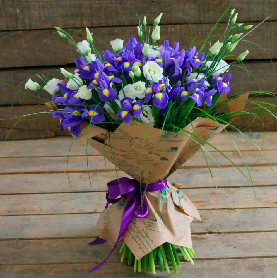 Букет «Воздушные ириски» – яркий, женственный и озорной сюрприз для вашей подруги, мамы, сестры или...? Так кому Вы подарите этот яркий букет из ирисов и лизиантуса в стильной крафт-упаковке?
