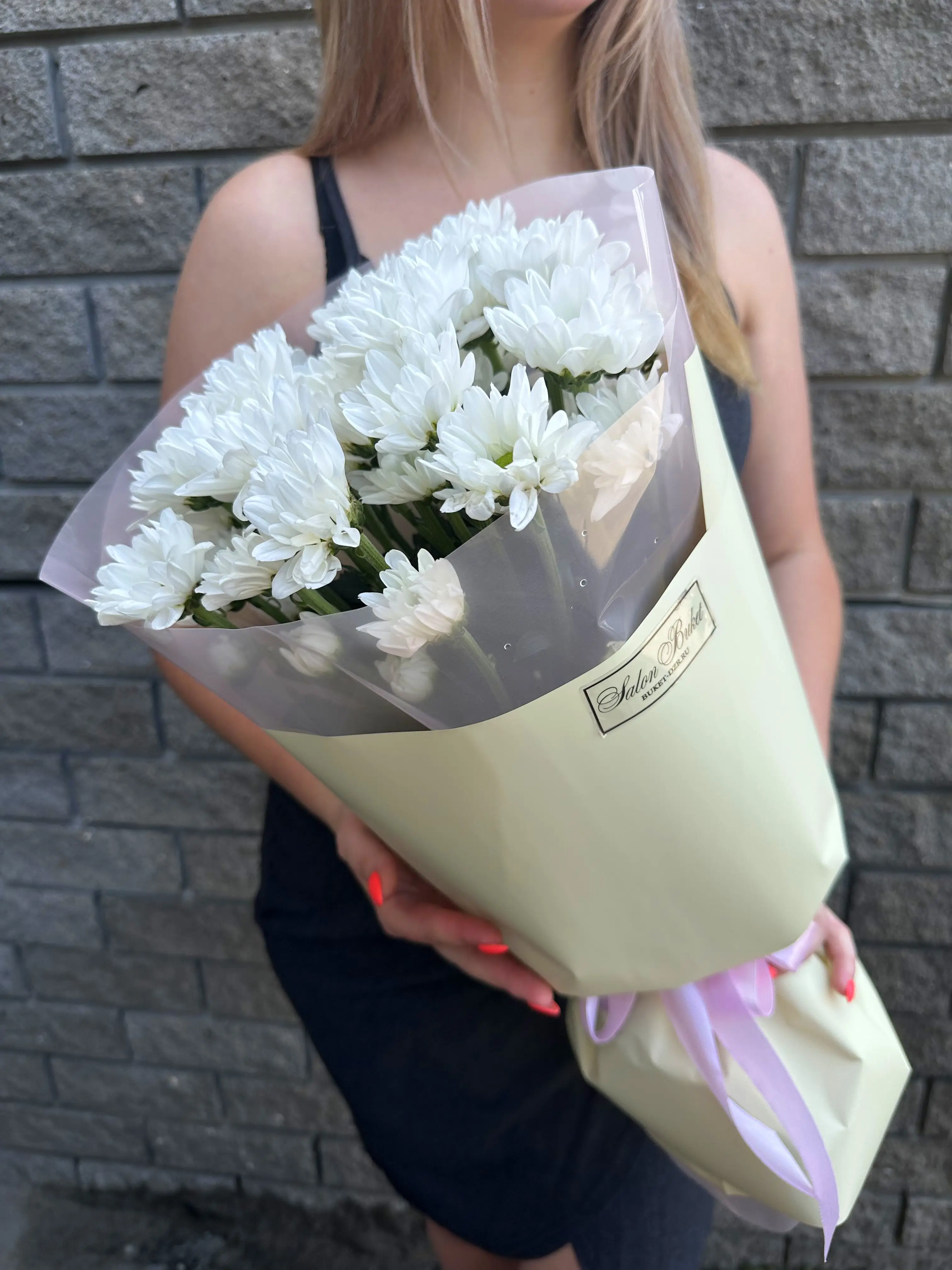 5 Кустовых хризантем в упаковке - пример оформления на фото. Состоит из: Хризантема кустовая - 5 шт,
