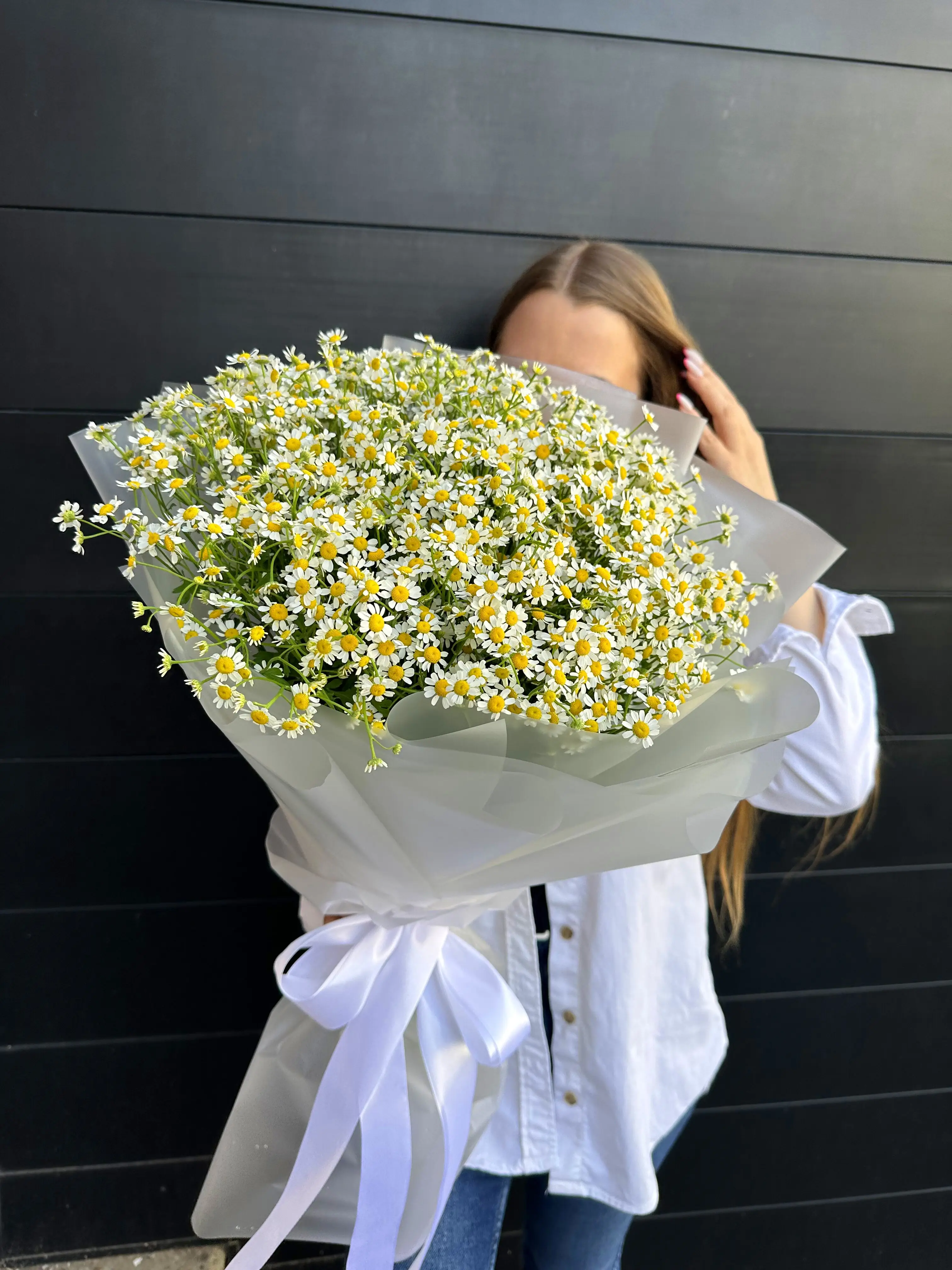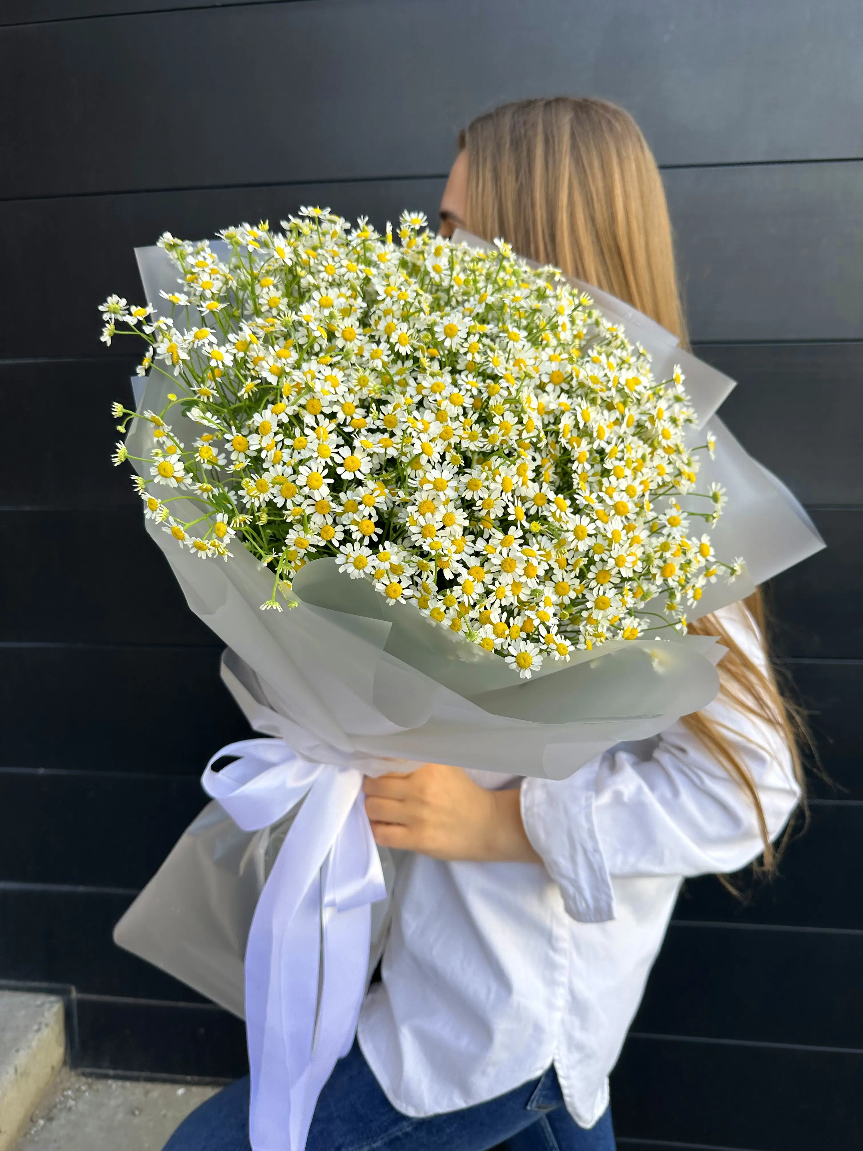 Матрикария в дизайнерской упаковке - пример оформления на фото. Состоит из: Матрикария - 25 шт, Дизайнерская упаковка, Лента атласная. Собираем только из свежих цветов, после сборки пришлем Вам фото. Доставим по г. Дзержинску и Нижегородской области, стоимость - 5450 руб..