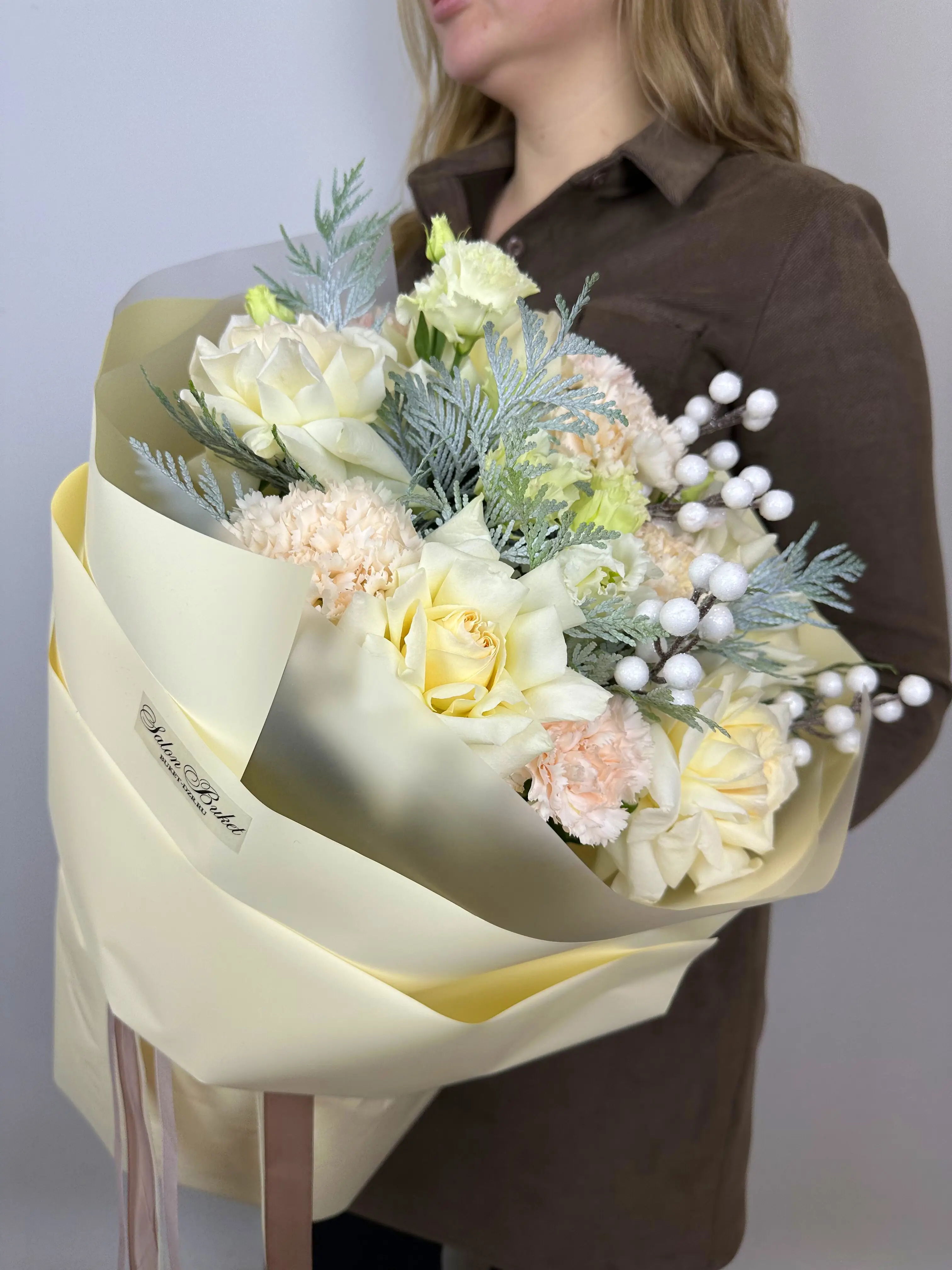 Букет составляется непосредственно в день доставки из свежих цветов, а затем с приятной улыбкой вручается адресату.