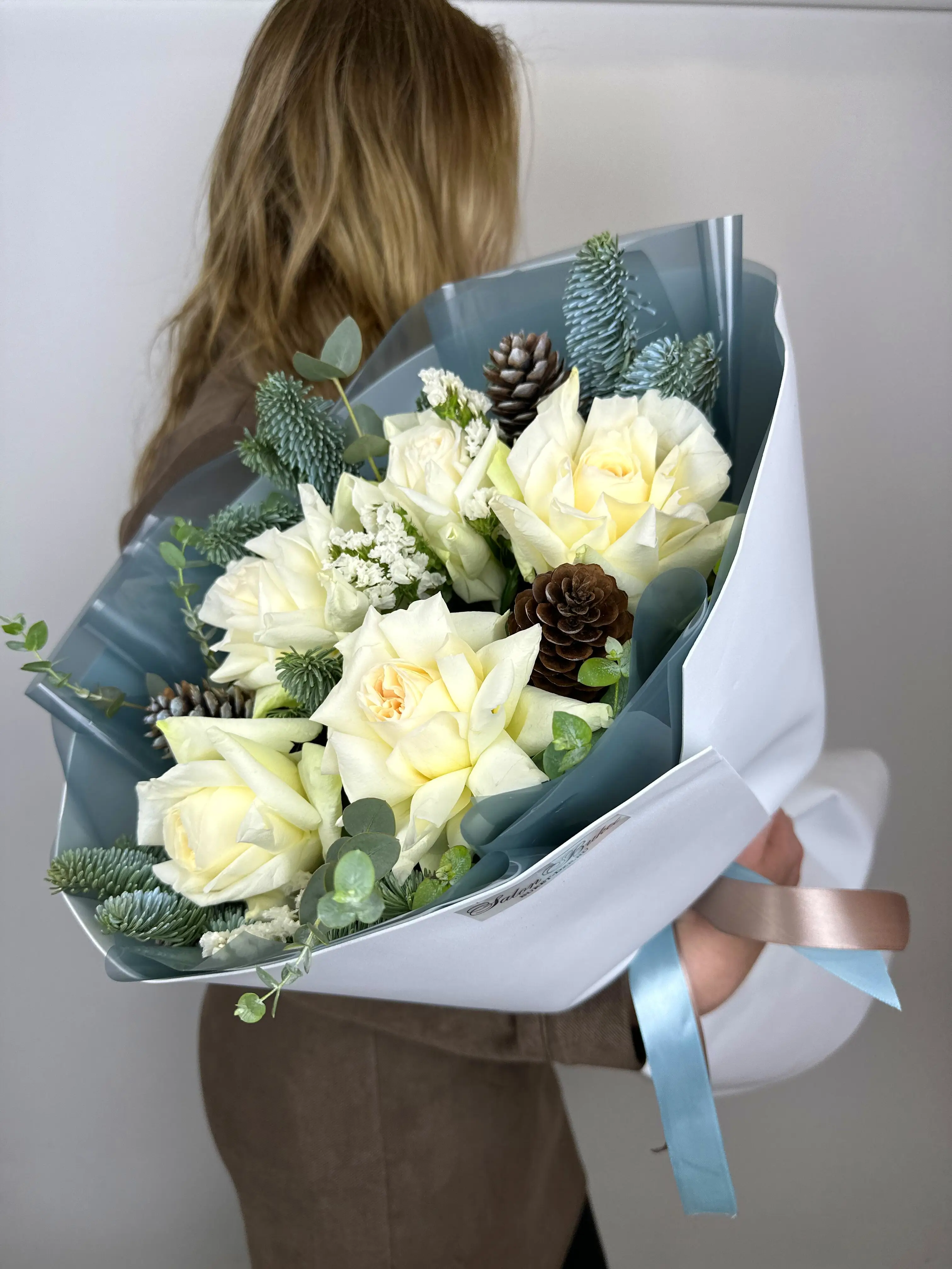 Букет зимняя ночь - пример оформления на фото. Состоит из: Роза Пионовидная - 5 шт,