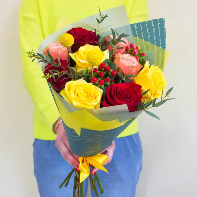 Букет "Огненный микс роз" в упаковке - пример оформления на фото. Состоит из: Роза - 9 шт.,