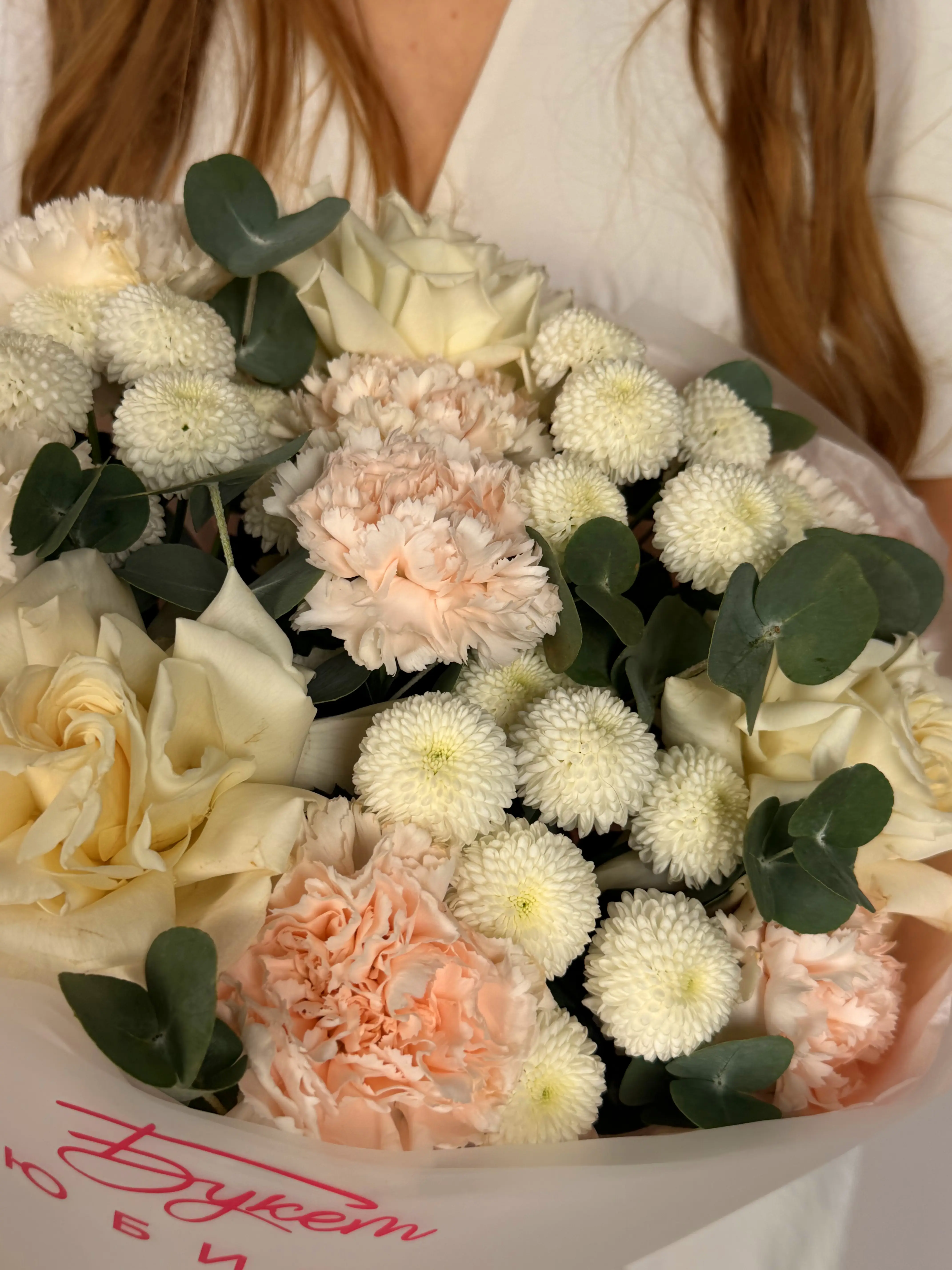 Воздушный букет с диантусами и розами - пример оформления на фото. Состоит из: Роза Эквадор - 3 шт,
