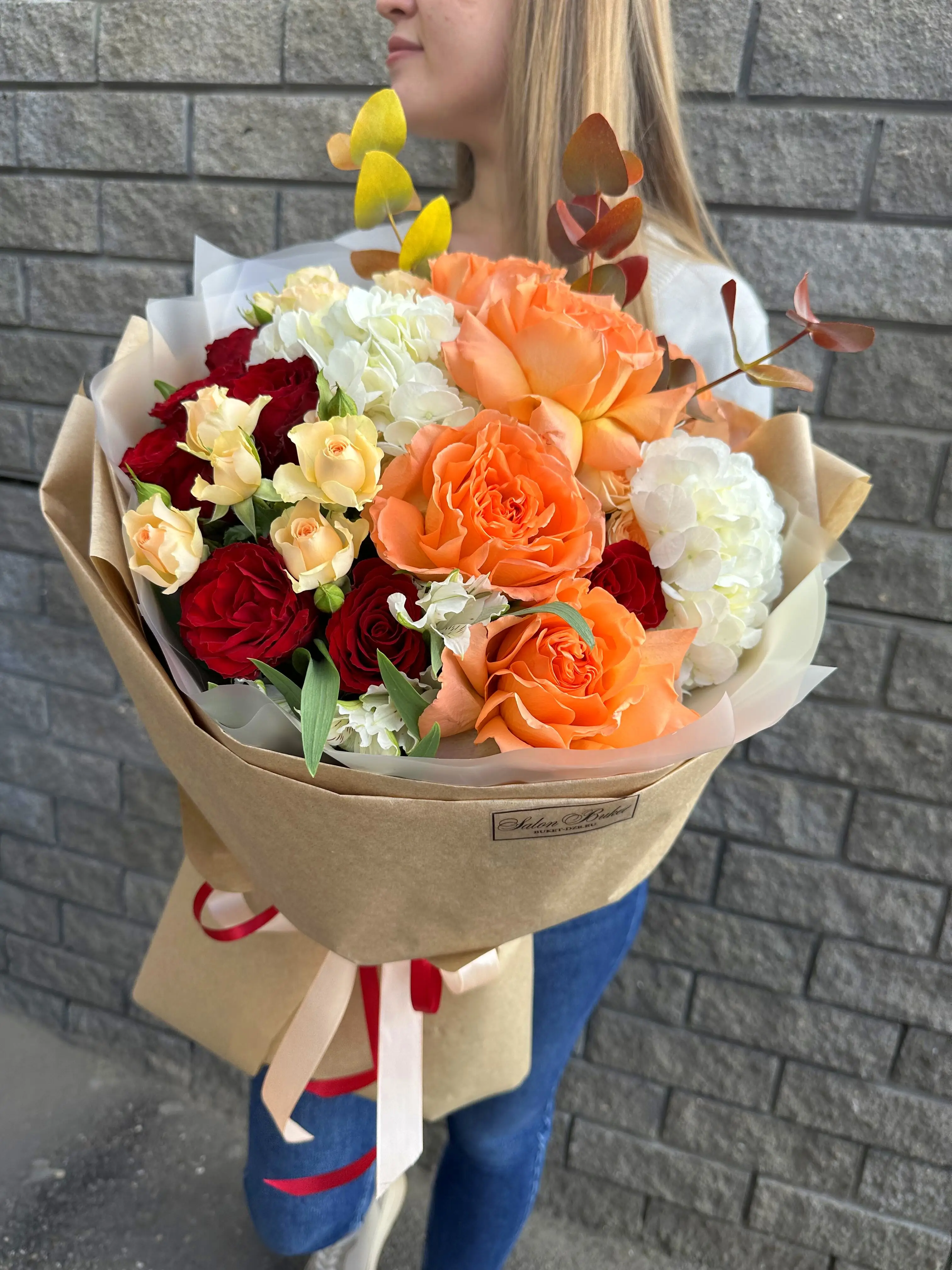 Яркий букет с розами и гортензией - пример оформления на фото. Состоит из: Роза Пионовидная - 5 шт,