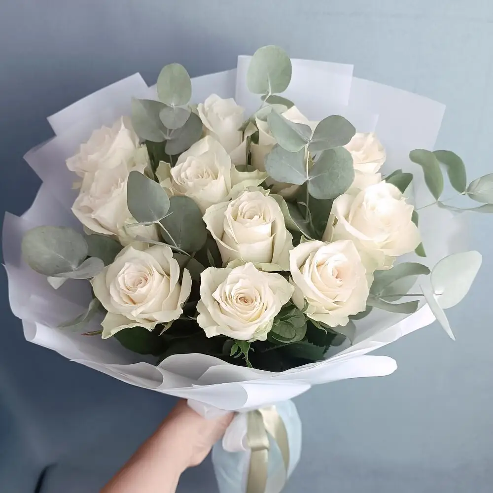 Букет из 11 белых роз с эвкалиптом