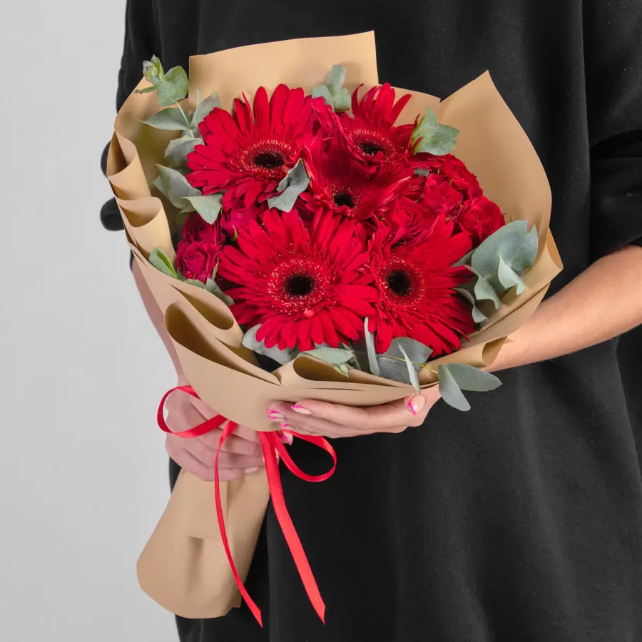 Букет из красных гербер и кустовой розы