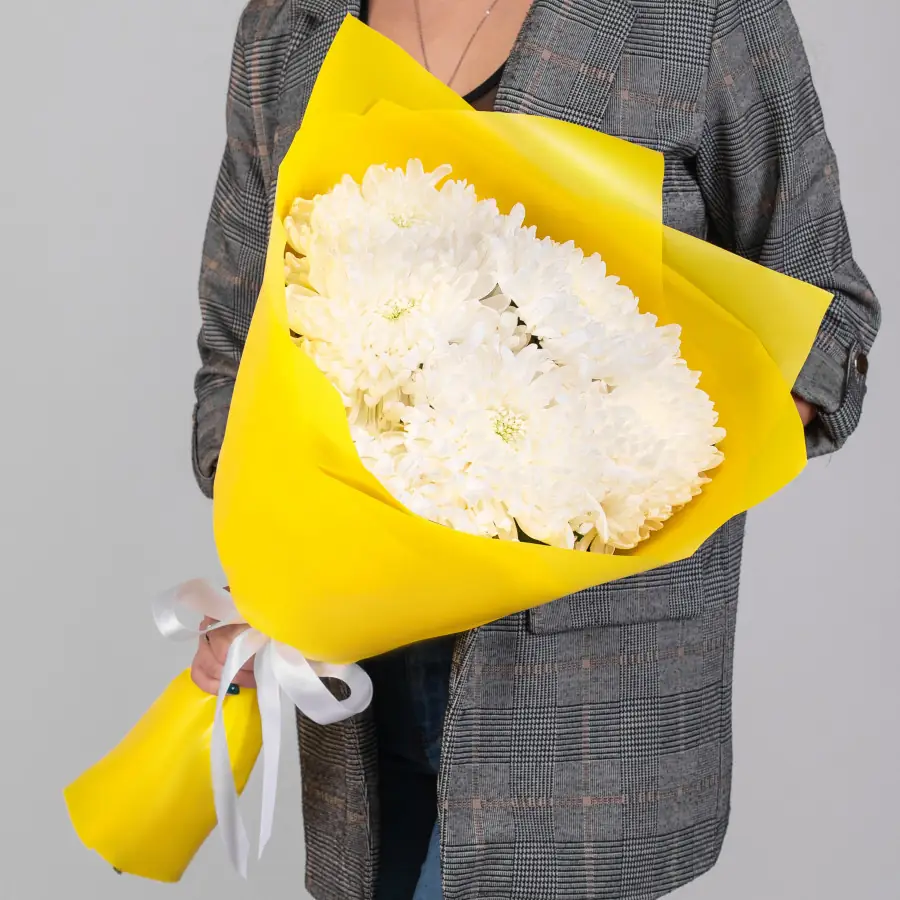 Хризантемы в желтой упаковке — купить по цене от 2540 руб. с доставкой в Дзержинске