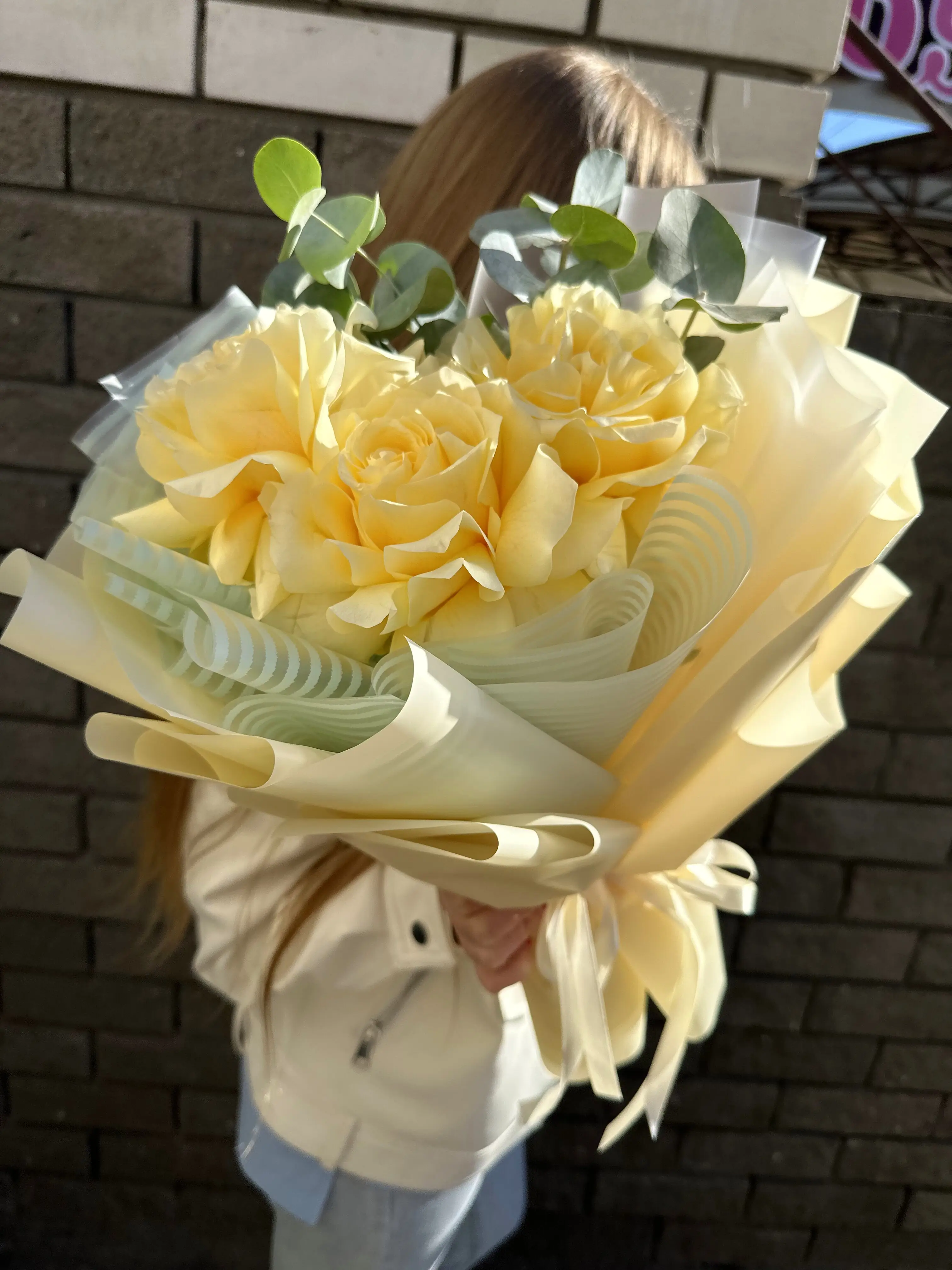 На фото - 3 Розы с эвкалиптом в упаковке . В составе данной композиции: Роза Пионовидная - 3 шт,