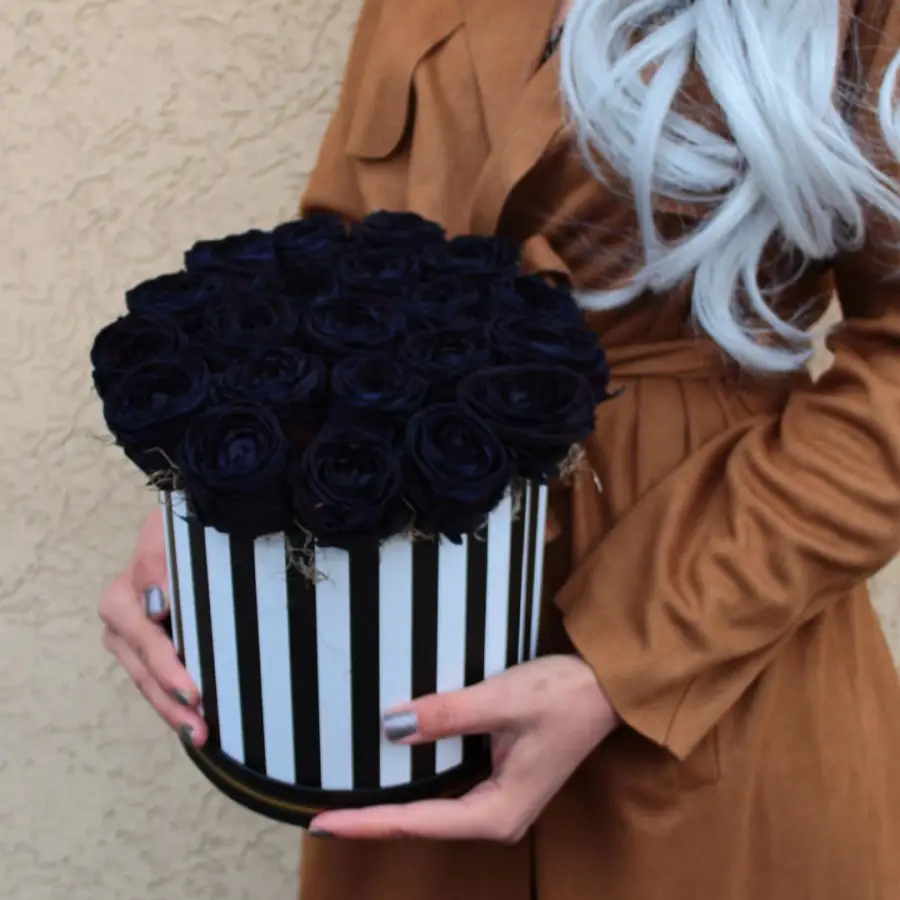 На фото - 25 Черных Роз в коробке. В составе данной композиции: Роза - 25 шт, Шляпная коробка, Флористическая губка , . На сайте buket-dzr.ru Вы найдете большой выбор недорогих букетов, цветочных композиций для любого повода. У нас можно заказать 25 Черных Роз в коробке за 10775 руб.