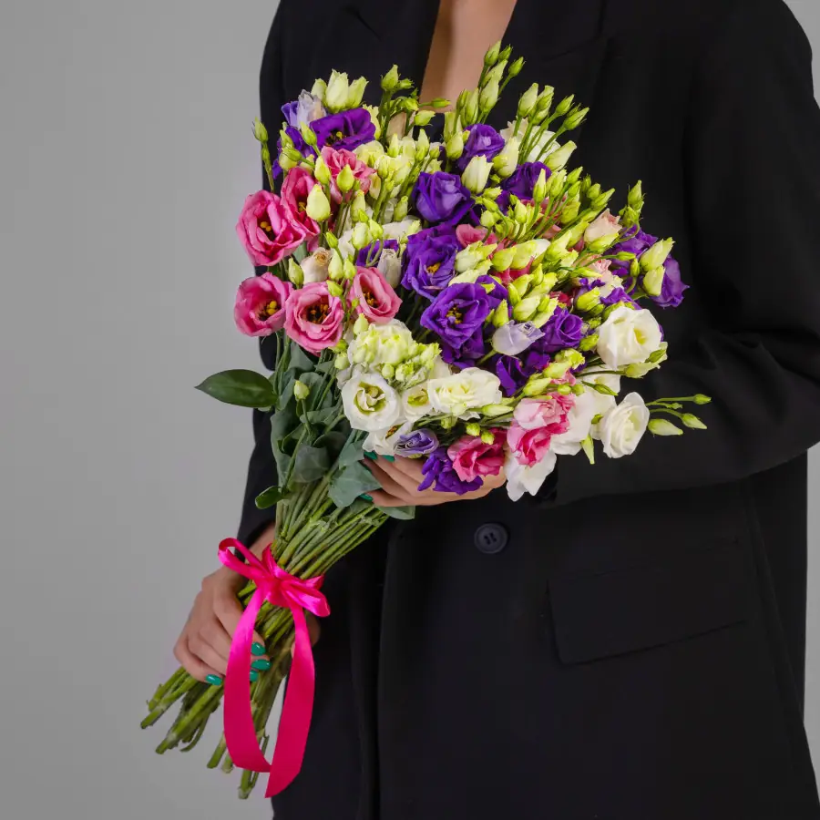 На фото - 19 Эустом Микс под ленту . В составе данной композиции: Эустома - 19 шт, Лента атласная , . На сайте buket-dzr.ru Вы найдете большой выбор недорогих букетов, цветочных композиций для любого повода. У нас можно заказать 19 Эустом Микс под ленту за 7800 руб.