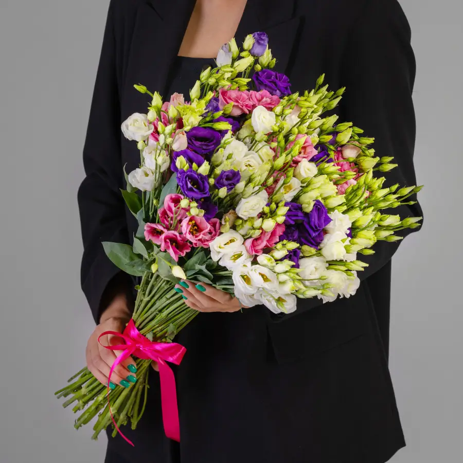 На фото - 25 Эустом Микс под ленту . В составе данной композиции: Эустома - 25 шт, Лента атласная , . На сайте buket-dzr.ru Вы найдете большой выбор недорогих букетов, цветочных композиций для любого повода. У нас можно заказать 25 Эустом Микс под ленту за 10200 руб.