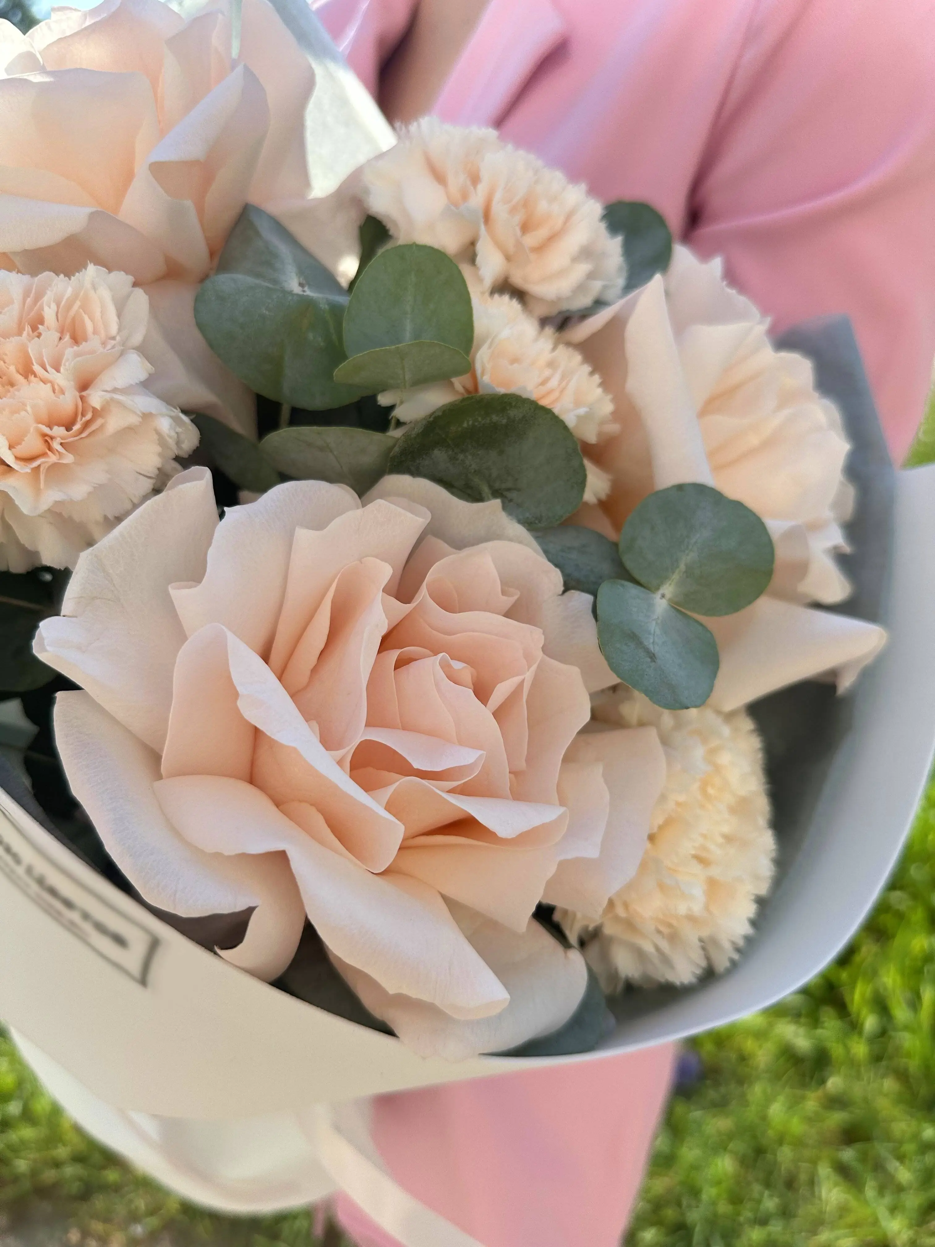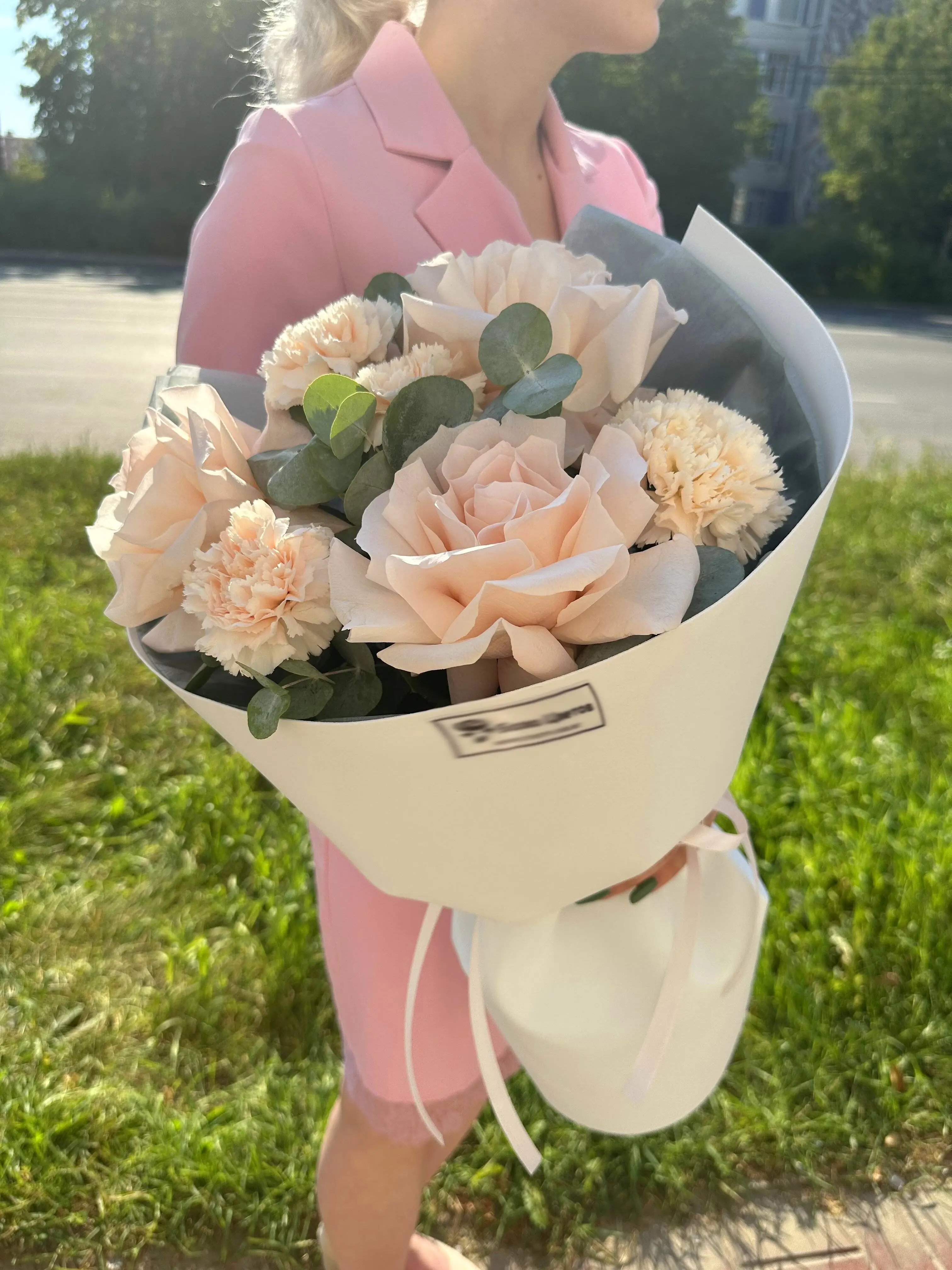 Диантусы, известные своим тонким пряным ароматом и удивительной стойкостью, придают букету объем, легкую воздушность и неповторимое очарование. Их нежные соцветия идеально дополняются безупречной красотой роз — символов любви, восхищения и вечной элегантности. Этот союз создает неповторимую игру текстур и оттенков, даря ощущение радости, заботы и нежности.