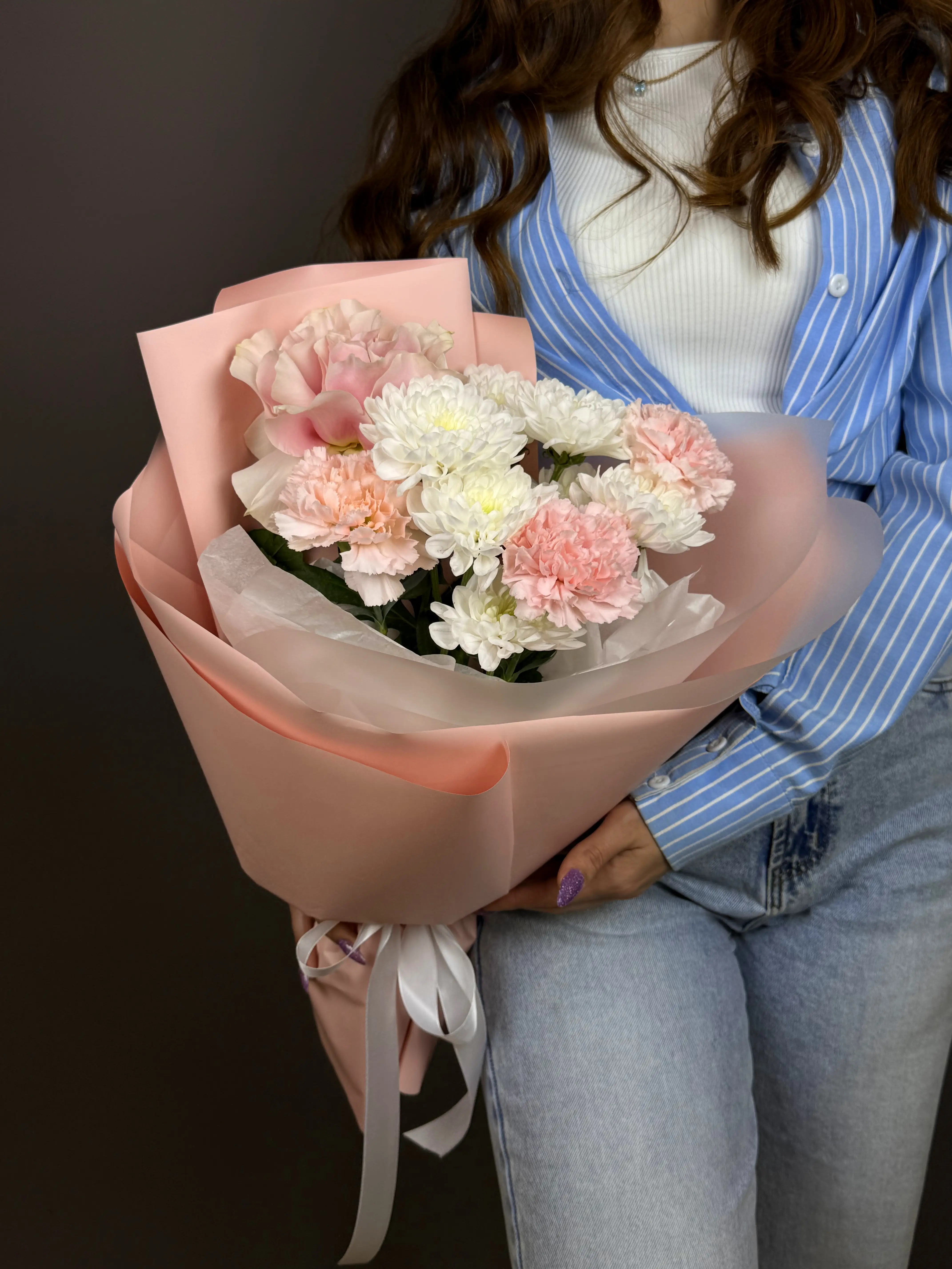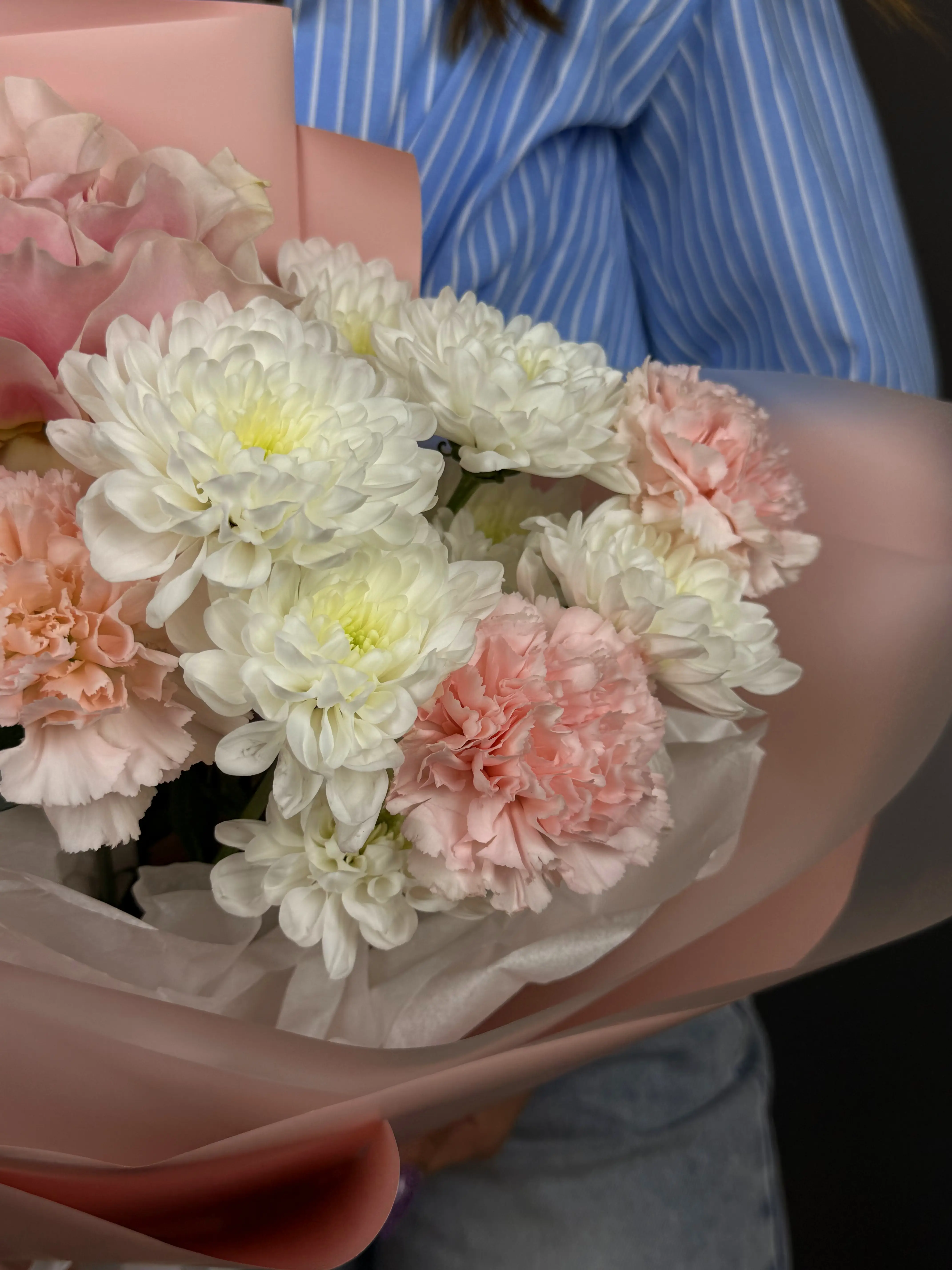 Этот нежный букет подарит вам истинное наслаждение. В его составе собраны диантусы и хризантемы, которые создают гармонию красоты и изящества. Хризантемы известны своей стойкостью и долговечностью, а диантусы привлекают внимание своими яркими цветами и приятным ароматом.