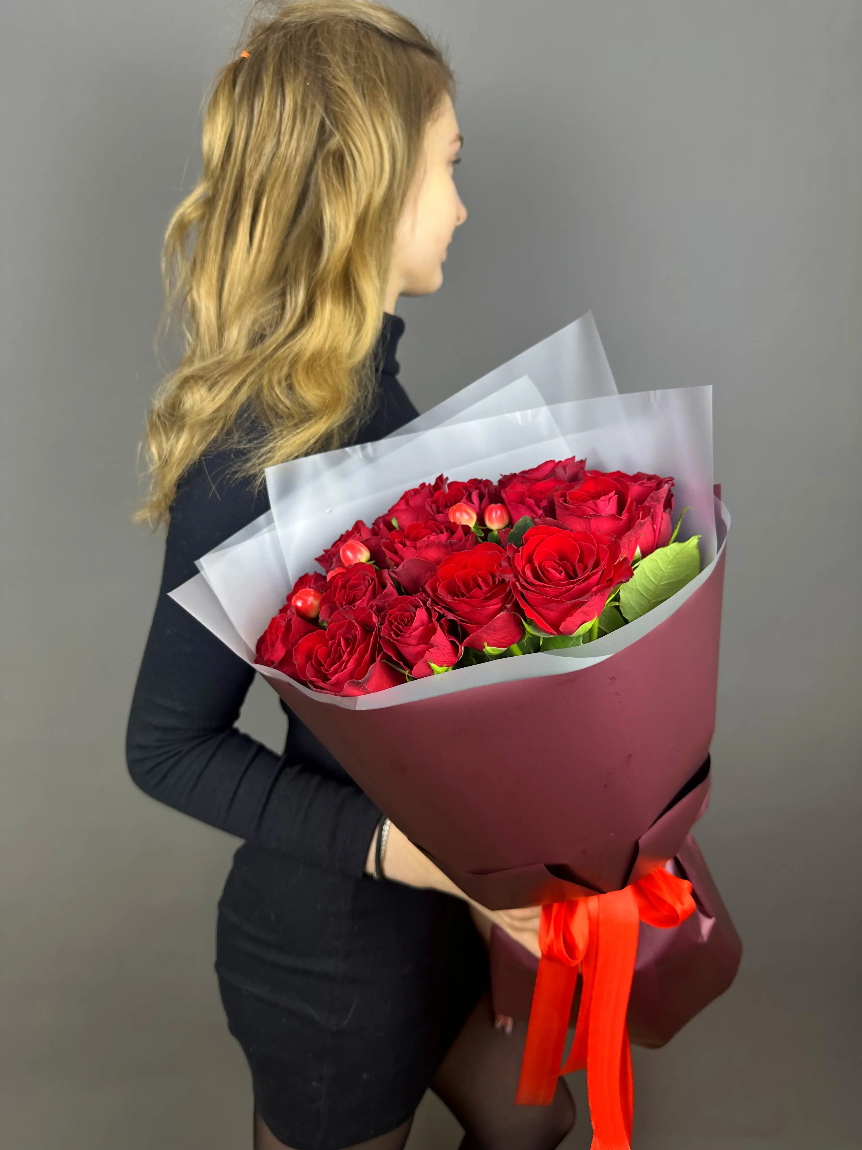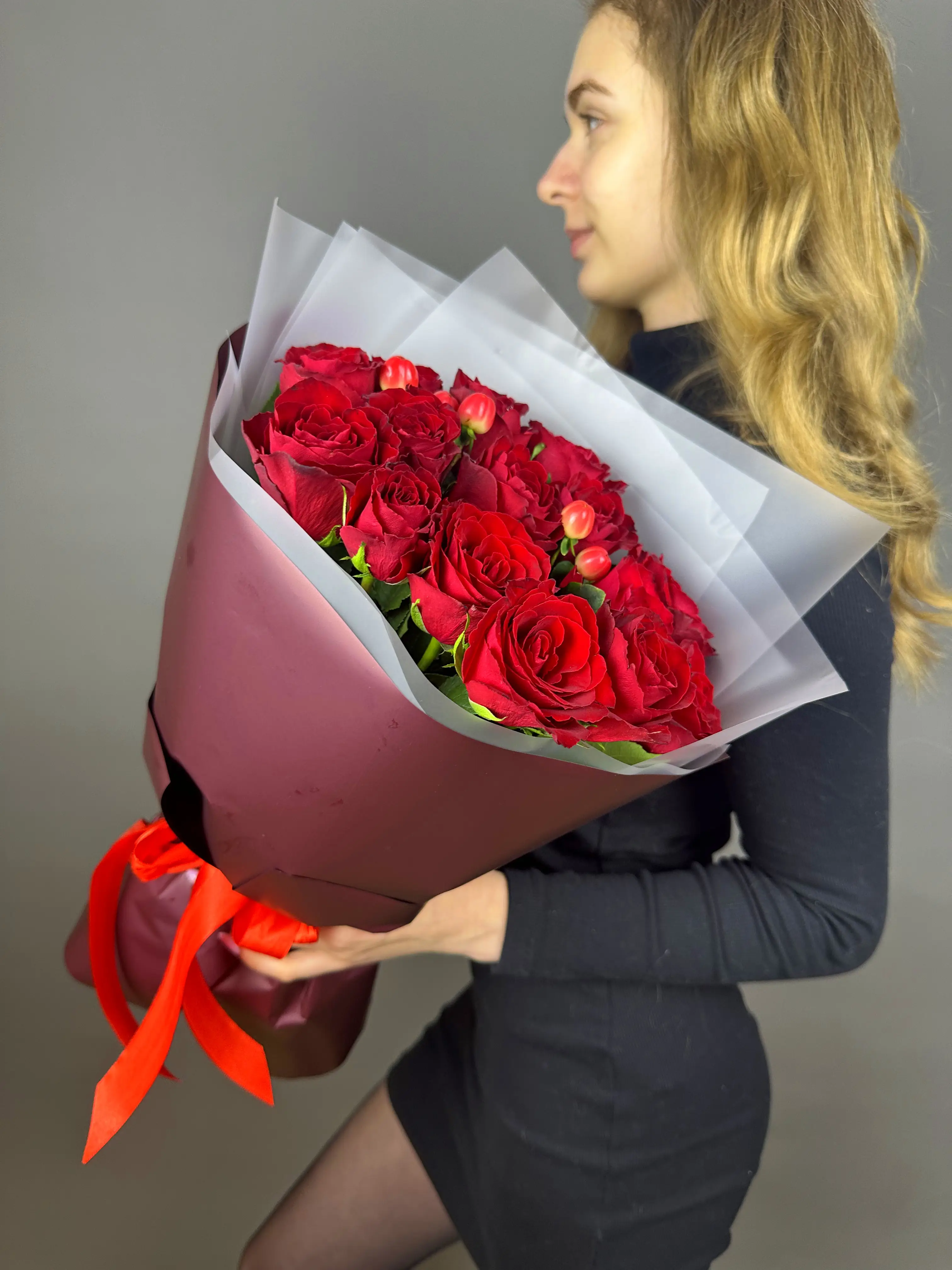 Каждая роза в этом букете имеет безупречную форму и нежный аромат, символизируя чистоту и красоту. Гиперикум же выступает в роли своеобразного акцента, привлекая внимание и создавая контраст с нежными лепестками роз.