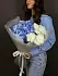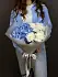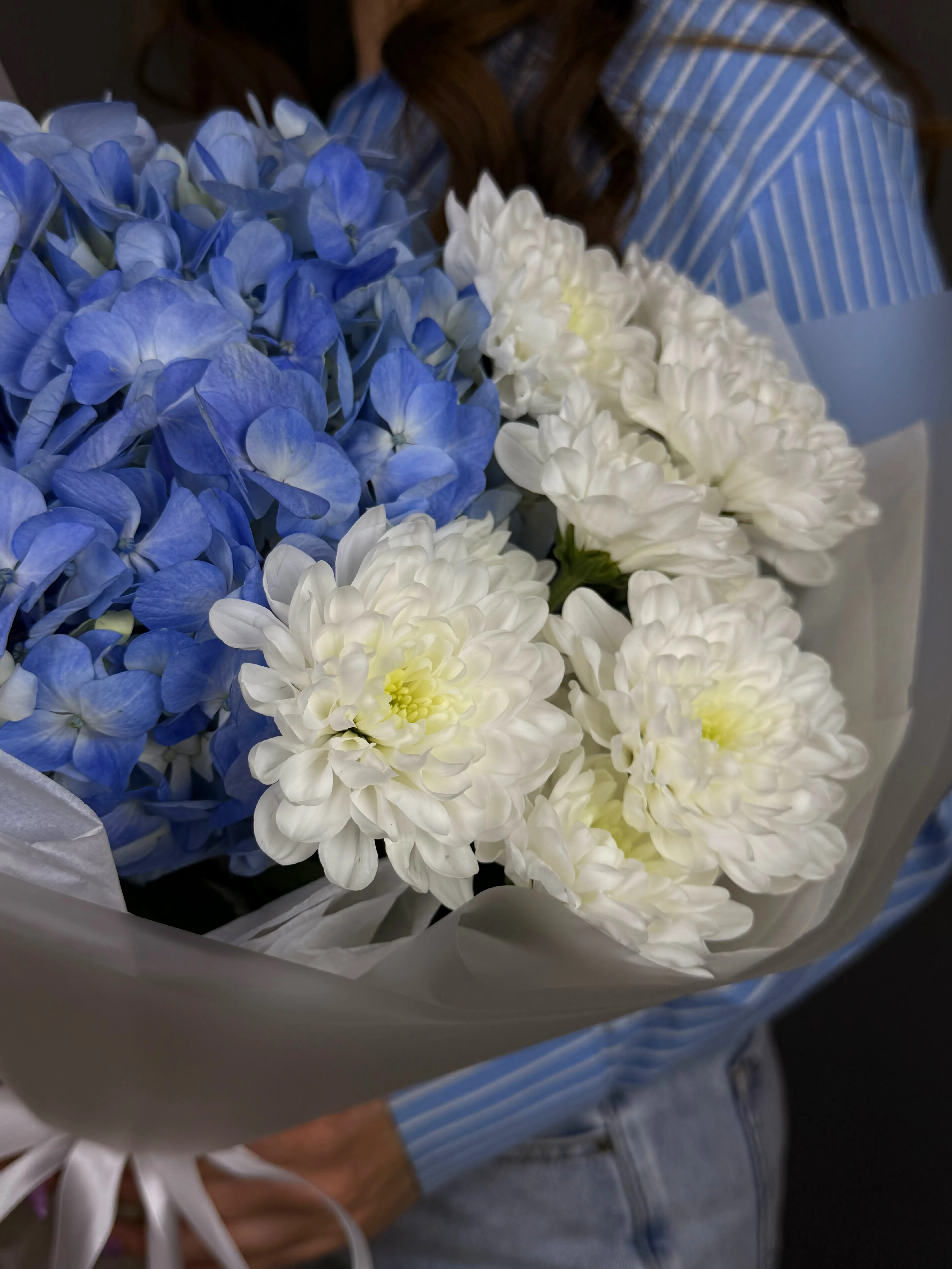 Голубая гортензия — редкое и ценное растение, которое обладает невероятной красотой и притягательностью. Ее нежные синие лепестки символизируют чистоту и искренность чувств, а кустовая хризантема добавляет букету пышности и объемности.