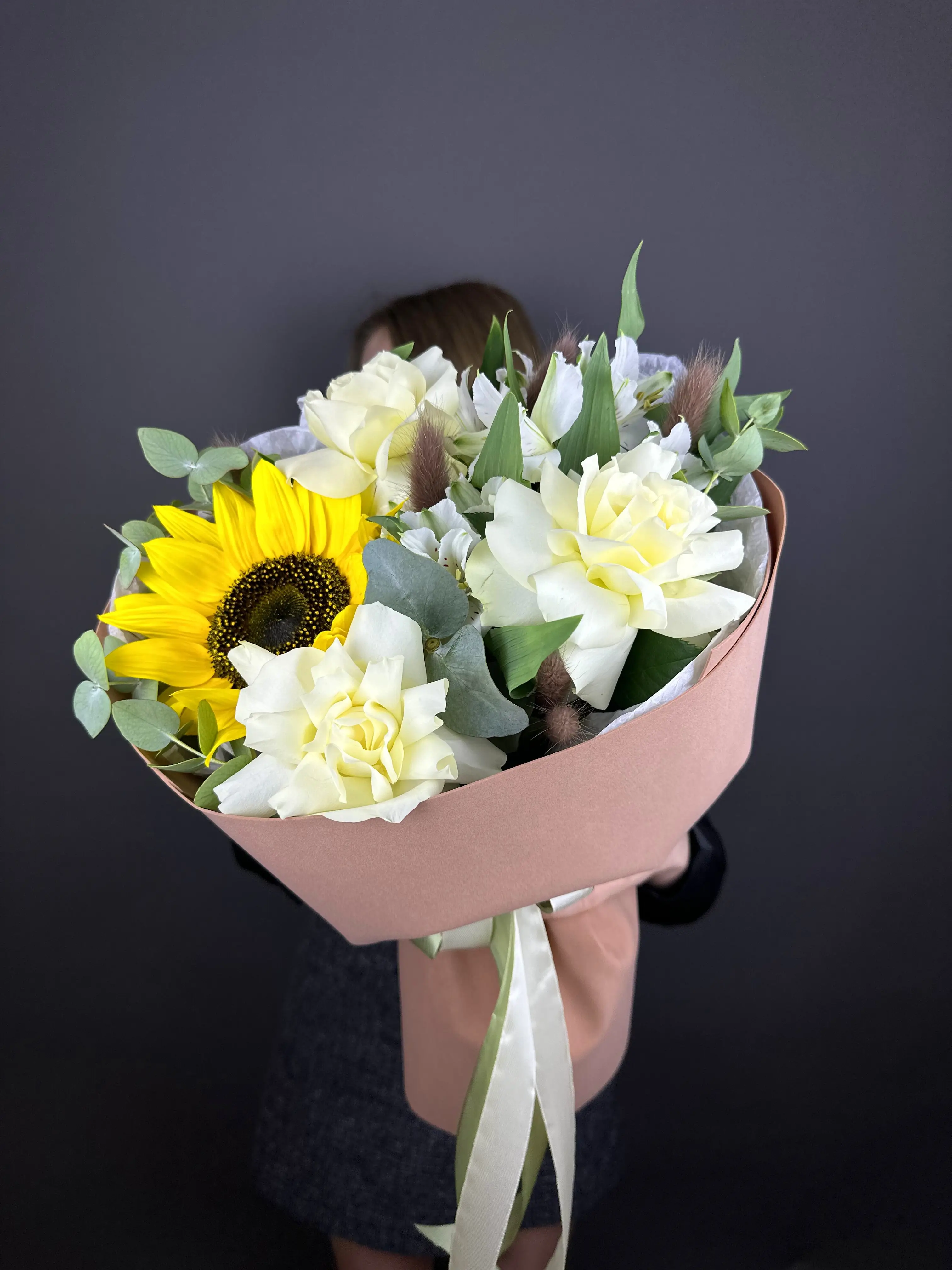 Подсолнухи в сочетании с изящными альстромериями создают атмосферу тепла и уюта. Наши флористы с большим вниманием подбирают каждый цветок, чтобы букет радовал своей свежестью и красотой как можно дольше.
