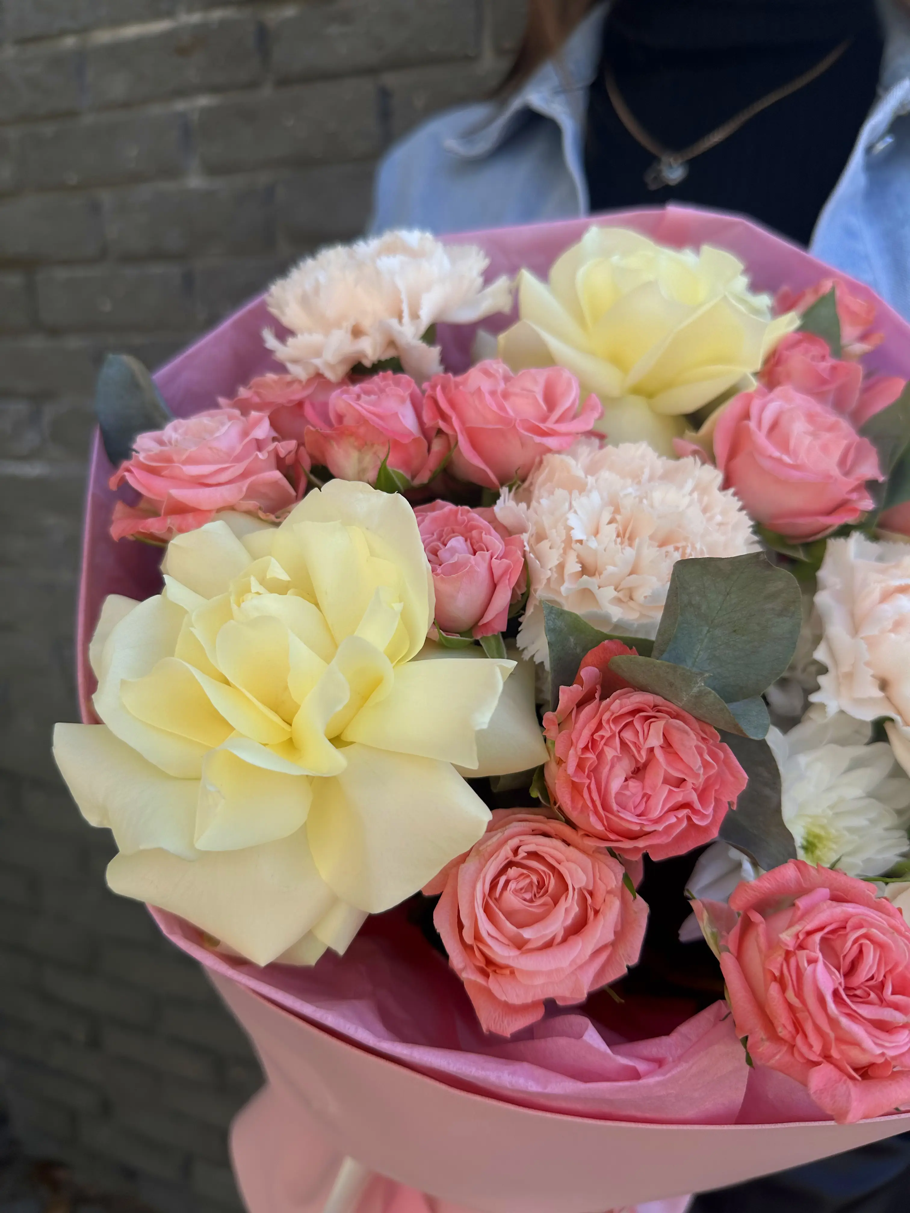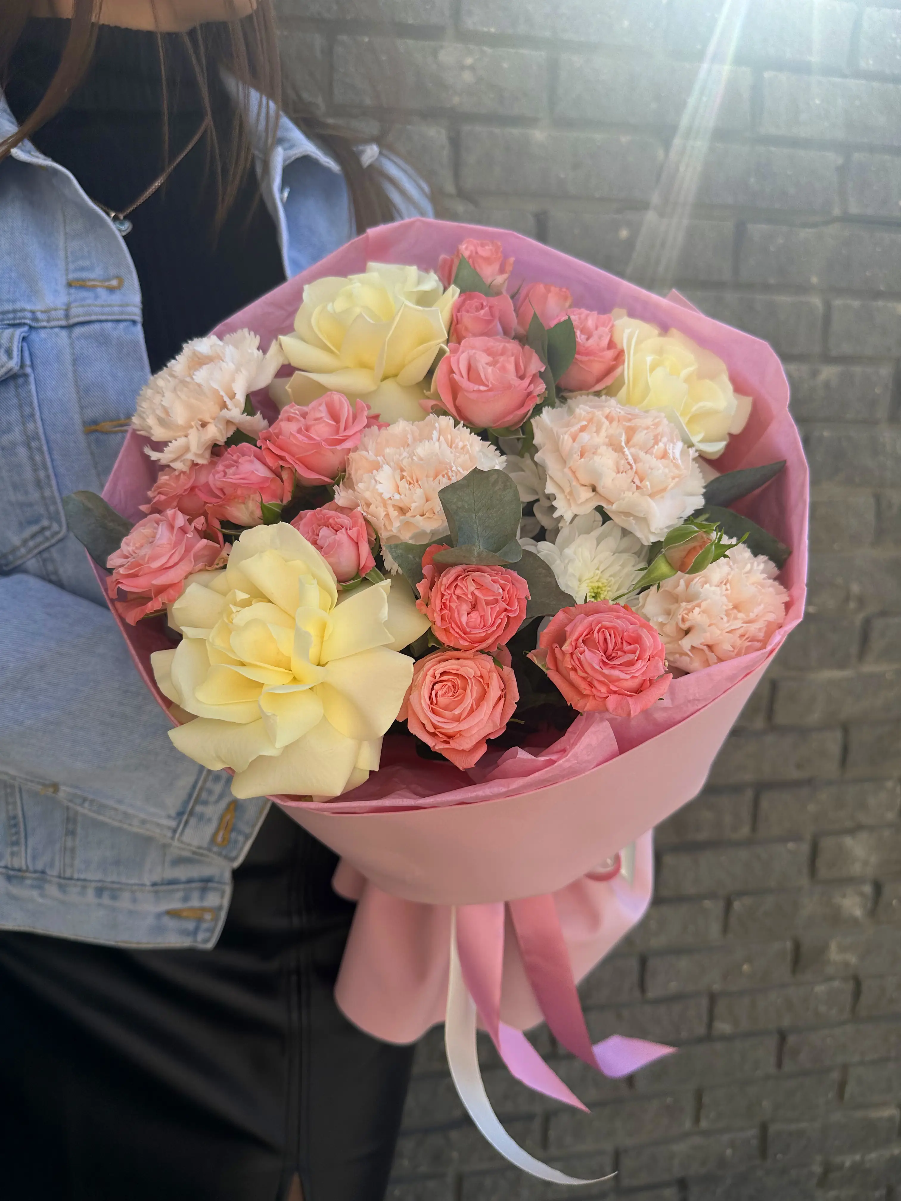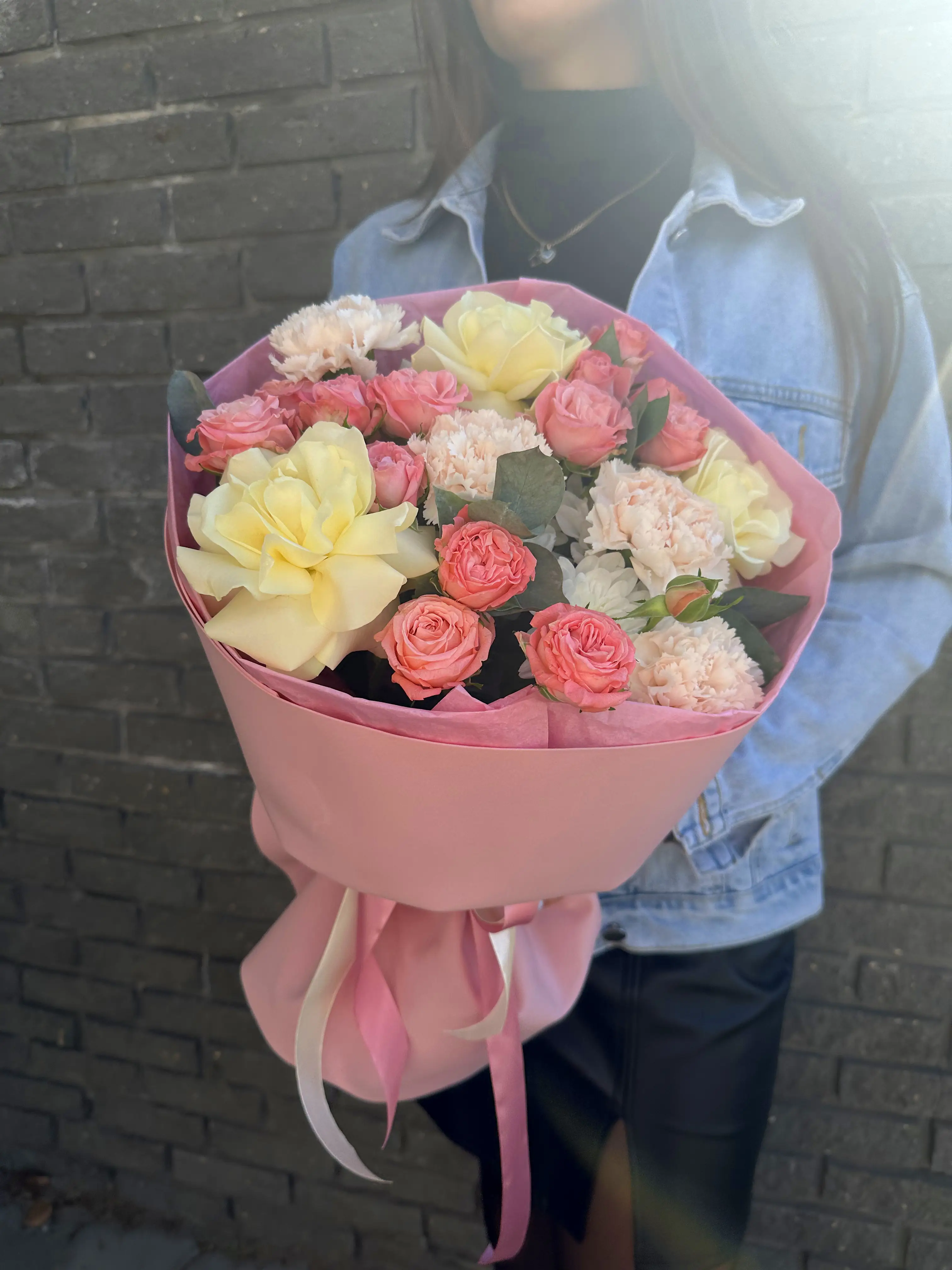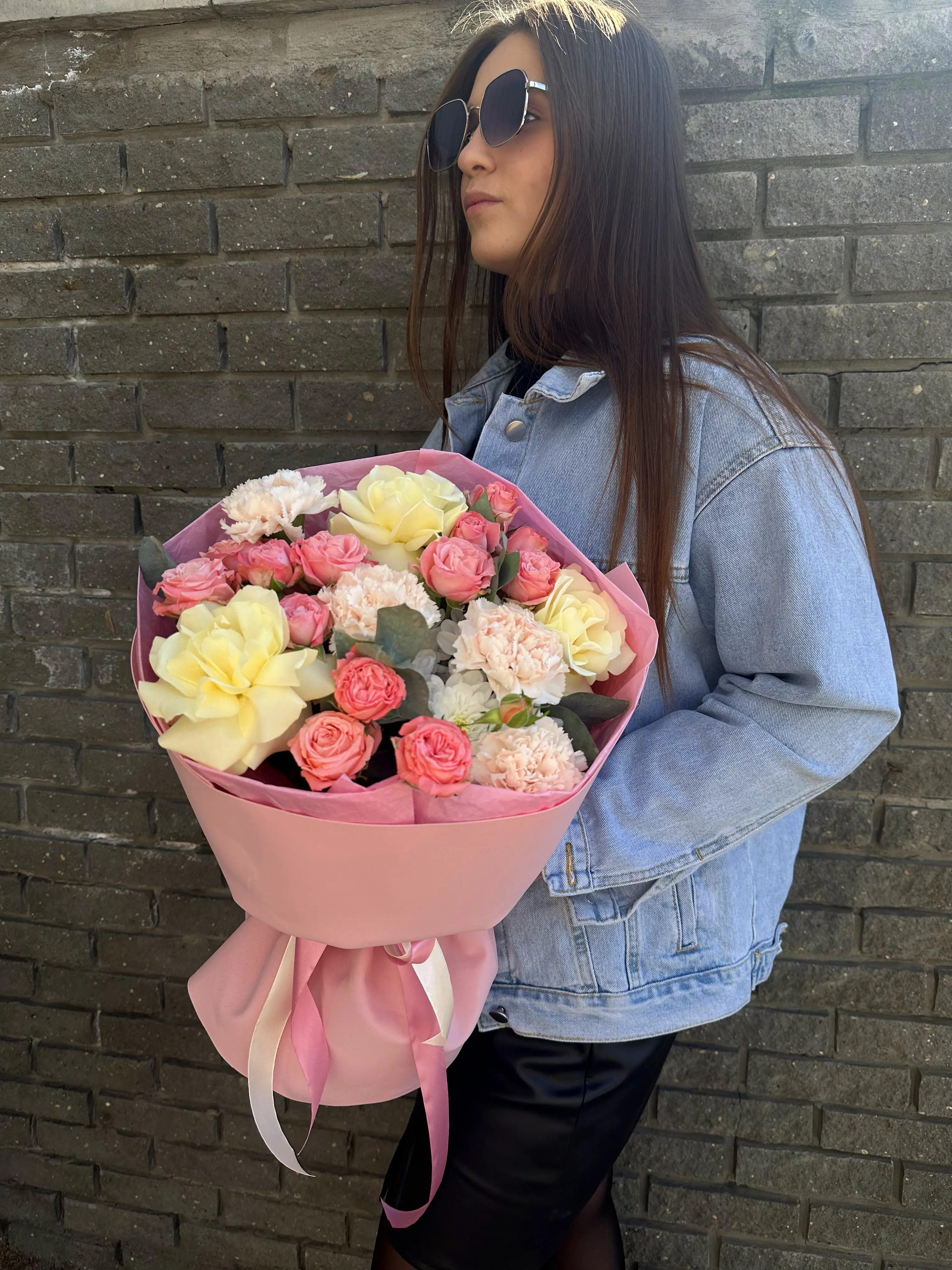 Букет составляется непосредственно в день доставки из свежих цветов, а затем с приятной улыбкой вручается адресату.