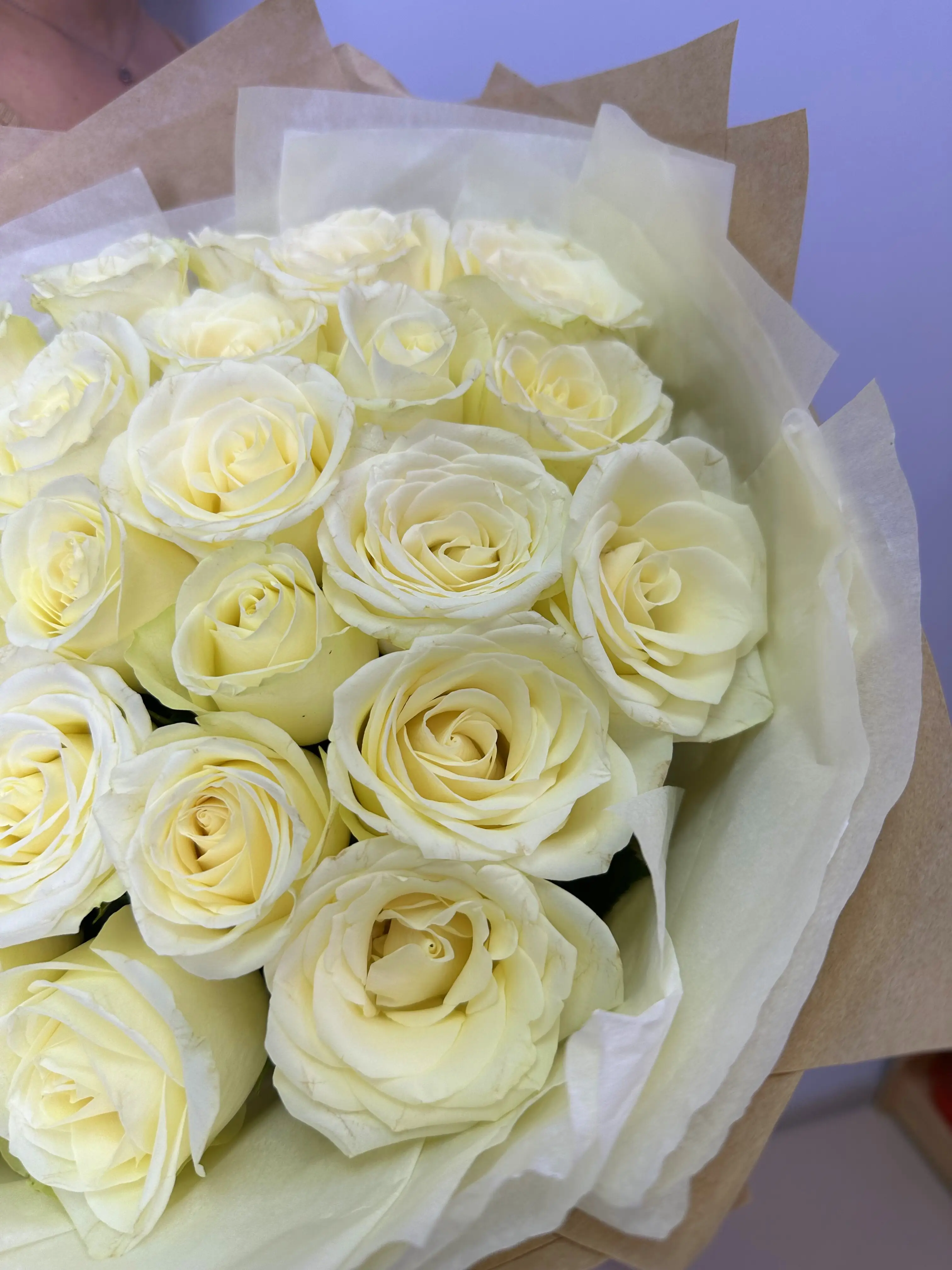 Представляем вашему вниманию эффектный букет из 25 белых роз в стильной крафтовой упаковке. Белые розы – это классический символ чистоты, нежности и искренних чувств. Крафтовая упаковка добавляет букету особую оригинальность и защиту от внешних воздействий.