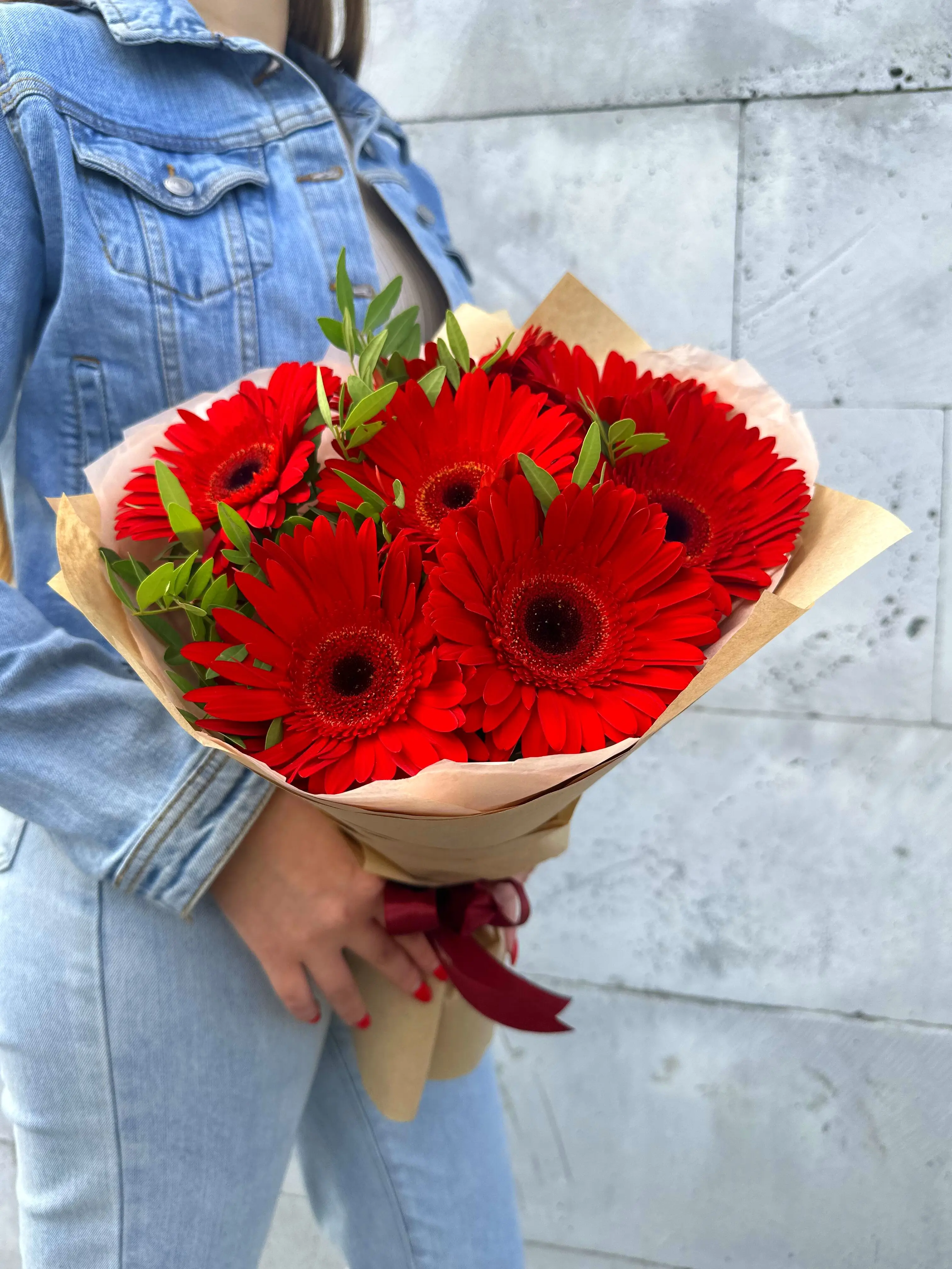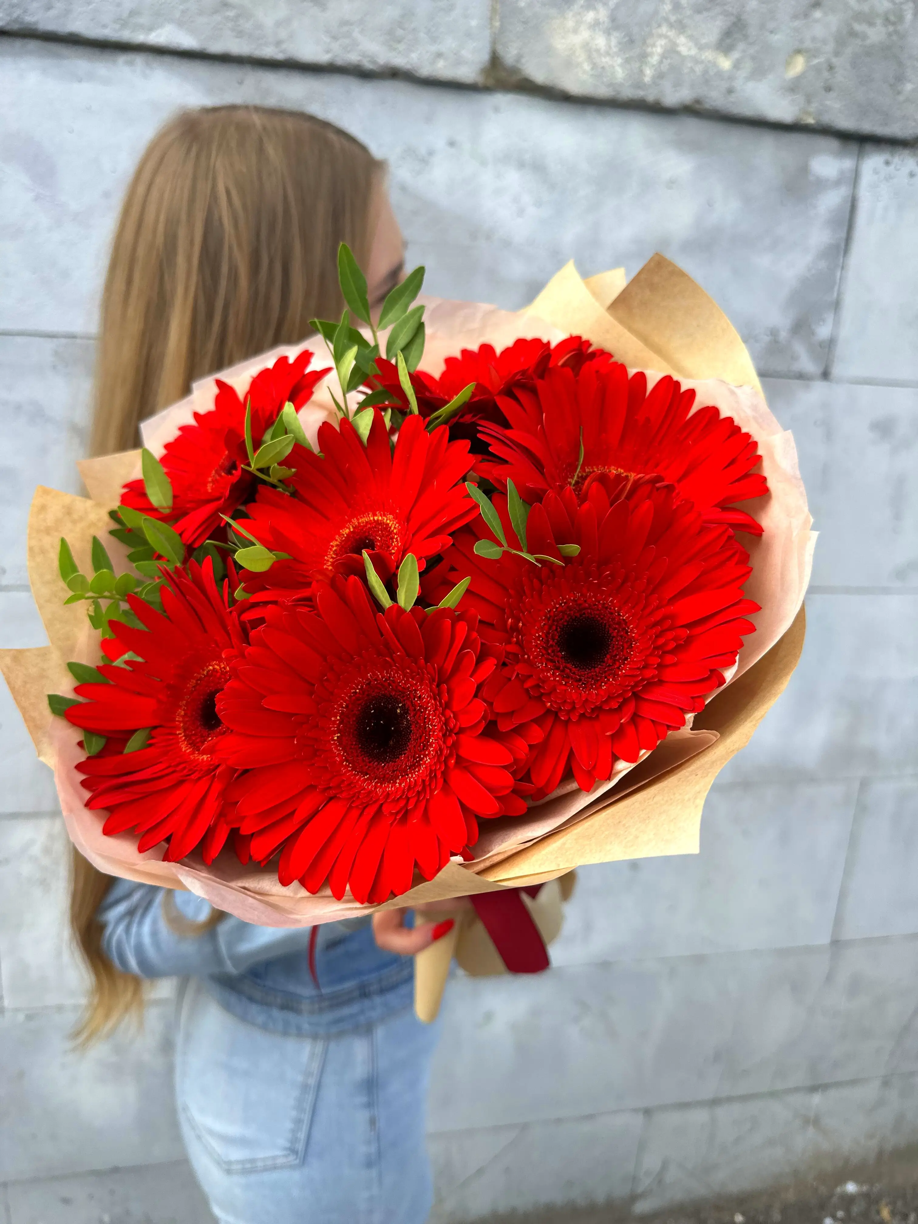 Искренний знак внимания и прекрасное дополнение к любому празднику — это семёрка ярких и красивых красных гербер, собранных в элегантную композицию с декоративными элементами зелени. Пышные цветки насыщенного алого оттенка раскрывают свою красоту и свежесть, радуя глаз и наполняя пространство утончённым ароматом.